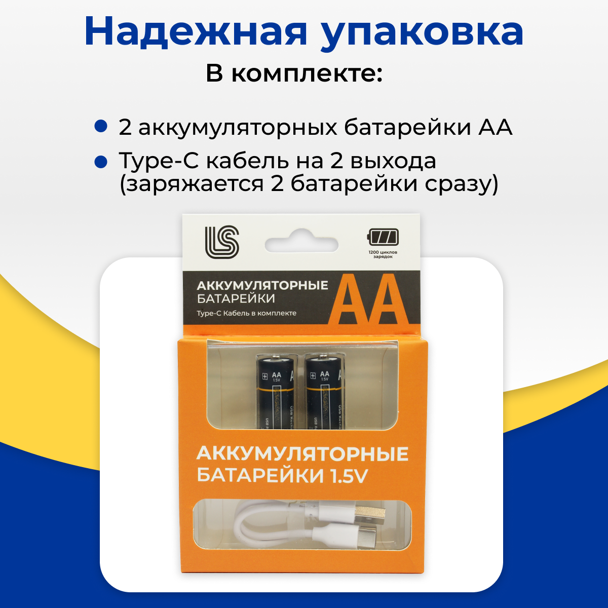 Аккумуляторные батарейки AA 2600 мАч Type-c в комплекте / Пальчиковые батарейки с разъемом Тайп Си / Заряжаемые батарейки 2 штуки в упаковке
