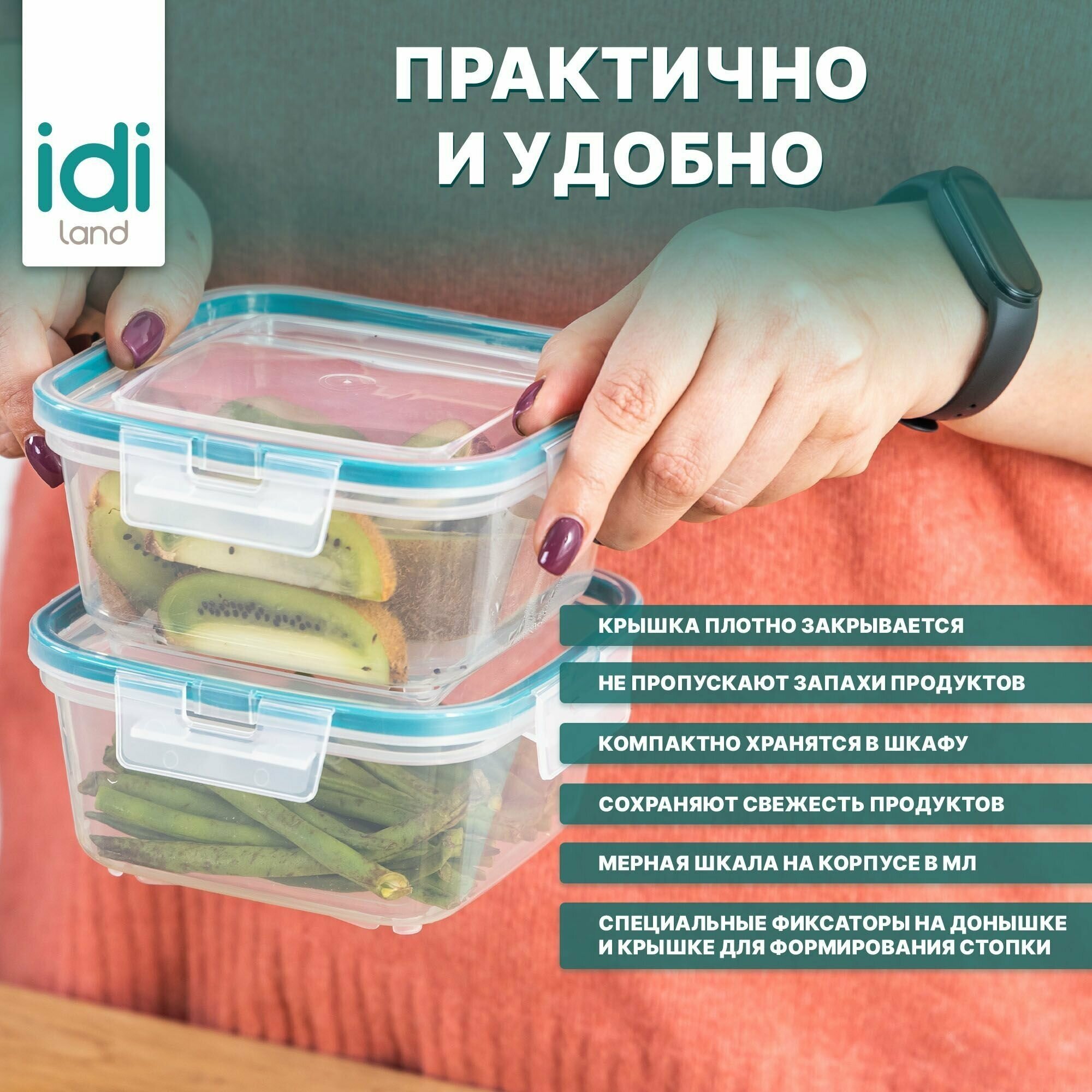 Набор контейнеров для еды квадратных 1,5 л х 3 шт. с защелками прозрачные зеленые интересное: