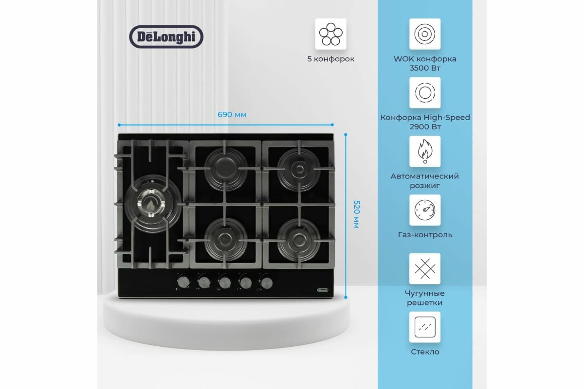 СохранитьГазовая варочная панель DeLonghi GERMANA 7GW NB, 69 см, черная, WOK-конфорка, чугунные решетки, автоматический розжиг, газ-контроль интересное: