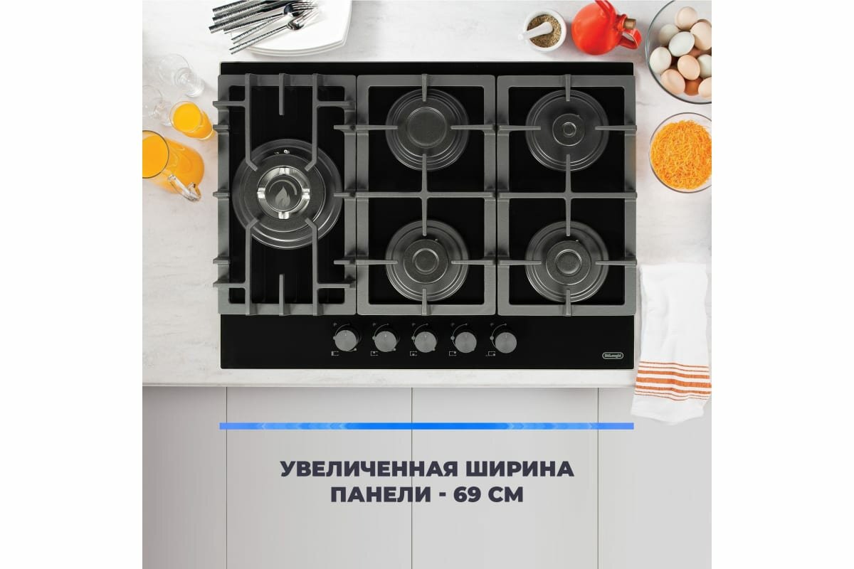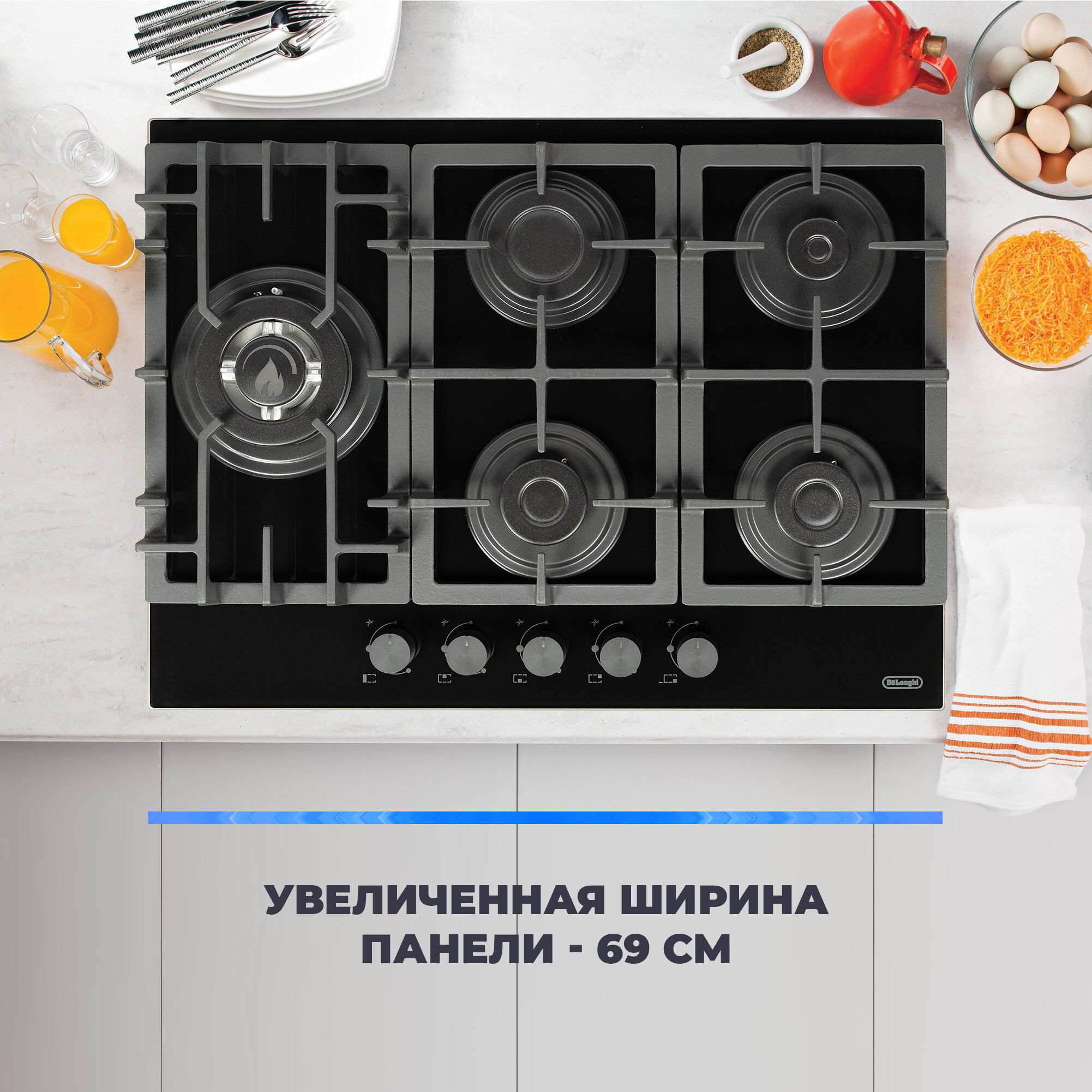 Варочная панель газовая 69 см DeLonghi GERMANA 7GW BB, WOK-конфорка, чугунные решетки, автоматический розжиг, газ-контроль, газовая варочная панель встраиваемая, варочная поверхность