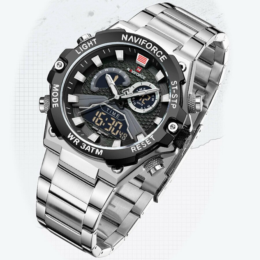 Часы наручные мужские электронные кварцевые Naviforce металлические, с секундомером и подсветкой, серебристые/черные