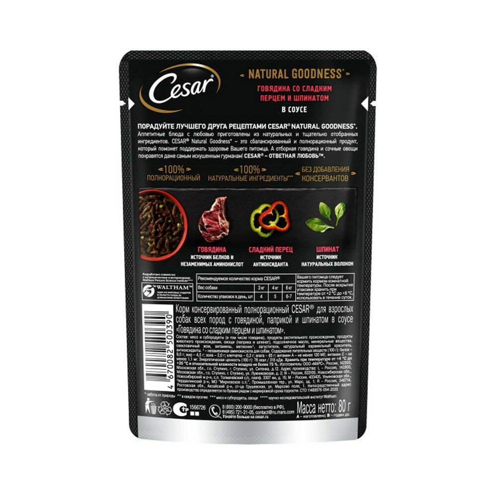 Влажный корм Cesar Natural Goodness для взрослых собак, с говядиной, сладким перцем и шпинатом в соусе, 28 шт по 80 г
