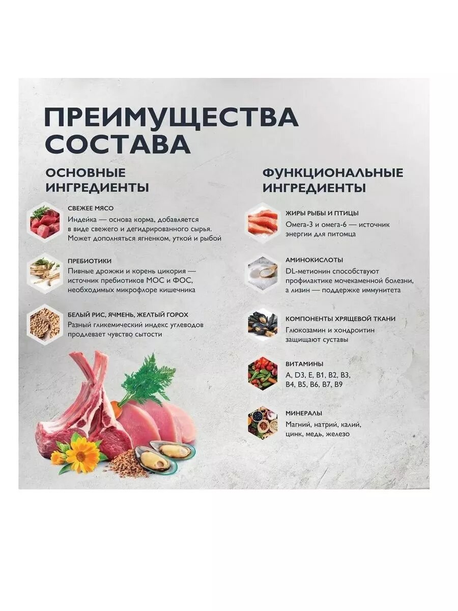 | Состав | курица 41%, кукуруза, пшеница, рис, куриный жир (консервирован токоферолами), рыбий жир из лосося, пивные дрожжи, натуральные ароматизаторы, сушеные яблоки, минеральные вещества, экстракт из трав и фруктов 300 мг/кг, маннанолигосахариды 150 мг/кг, фруктоолигосахариды 100 мг/кг, экстракт юкки Шидигера 80 мг/кг, органическая медь, органический цинк, органический селен |