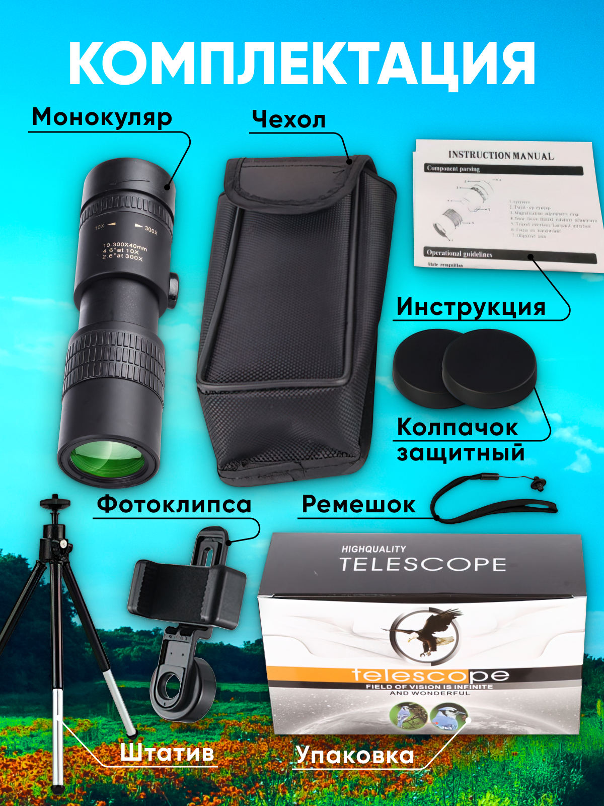 | Дополнительная информация | Комплектация: монокуляр, чехол, салфетка, фотоклипса, ремешок, штатив, упаковка, инструкция. |