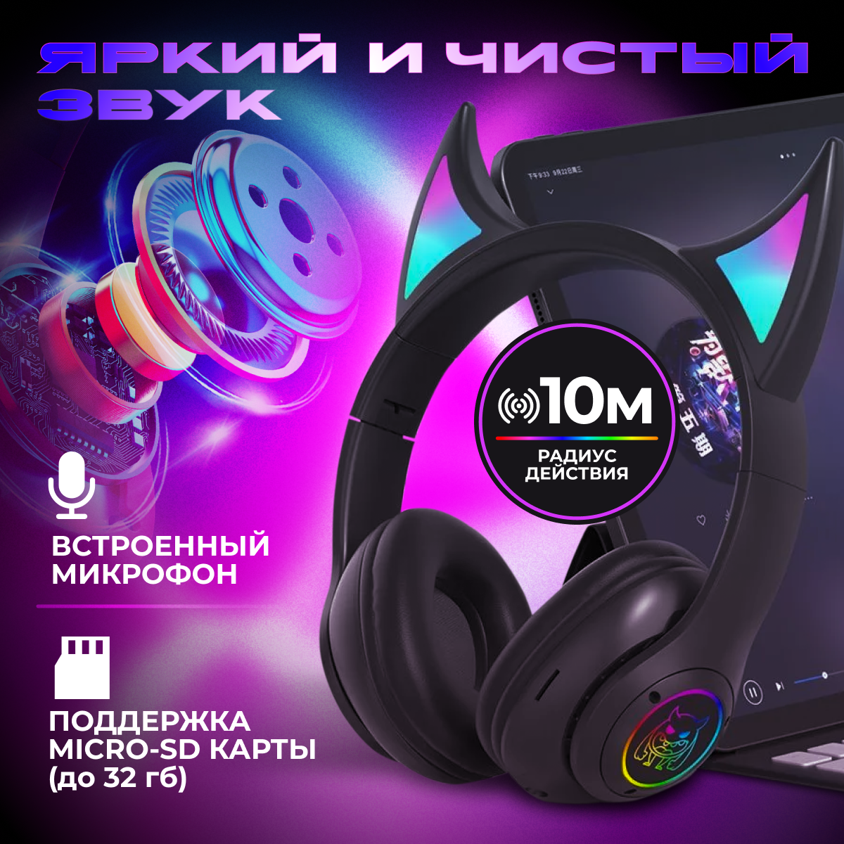 СохранитьНаушники полноразмерные беспроводные черные с светящимися RGB с ушками, рожками STN-25 c микрофоном Bluetooth 5.0 Аниме интересное: