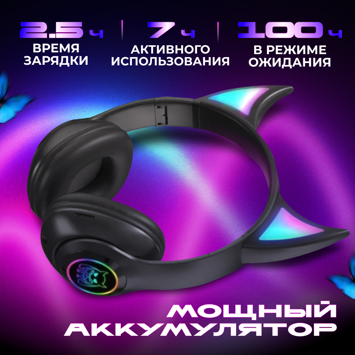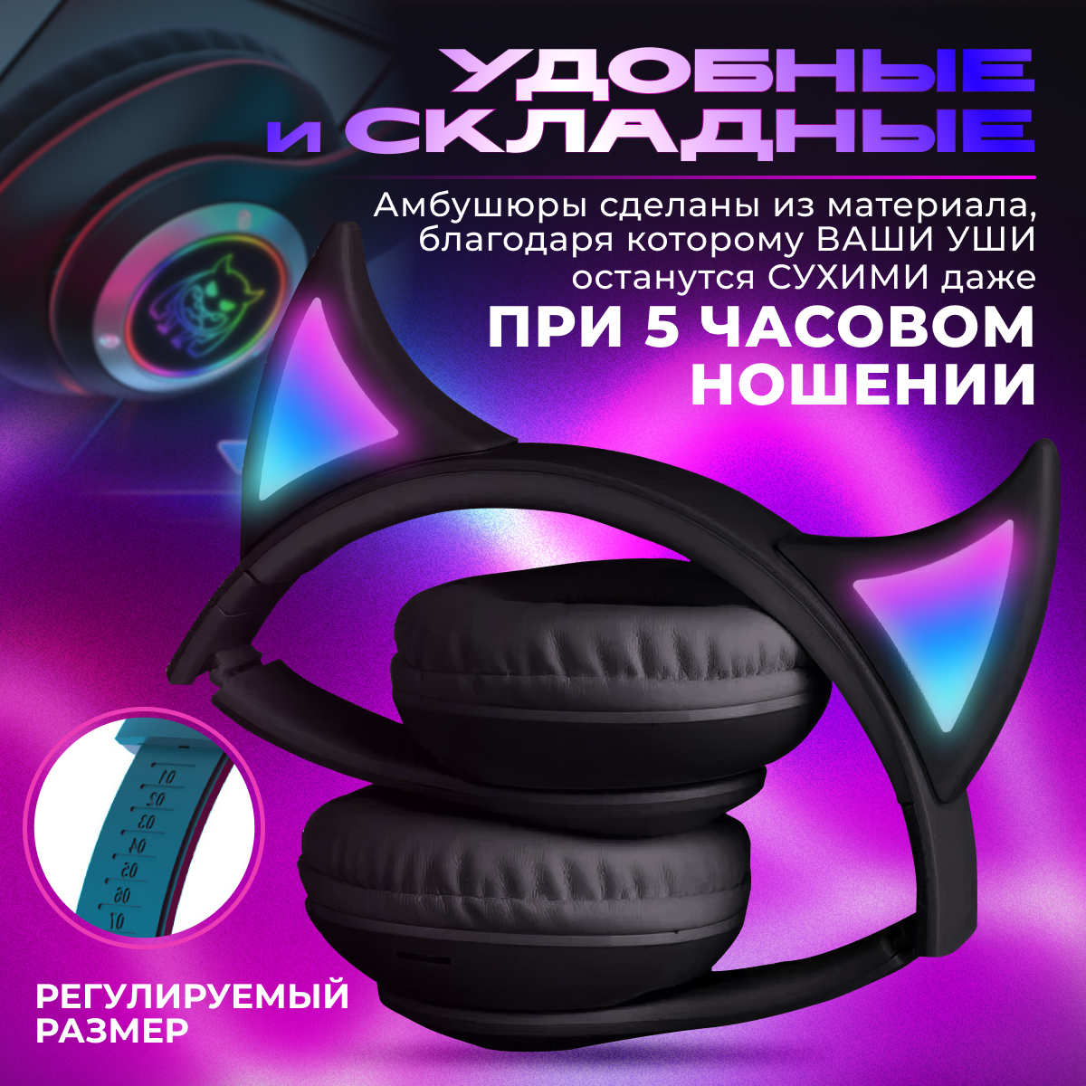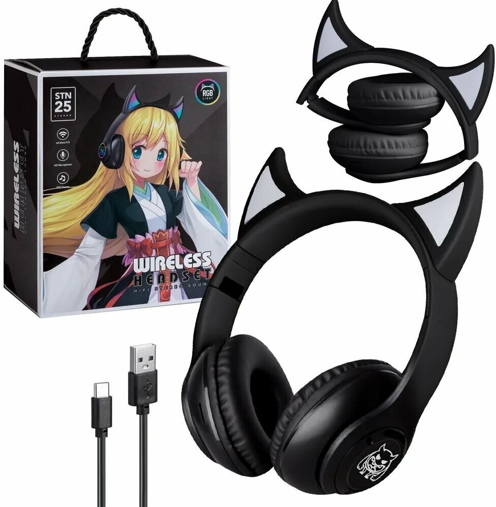 Купить Наушники полноразмерные беспроводные черные с светящимися RGB с ушками, рожками STN-25 c микрофоном Bluetooth 5.0 Аниме