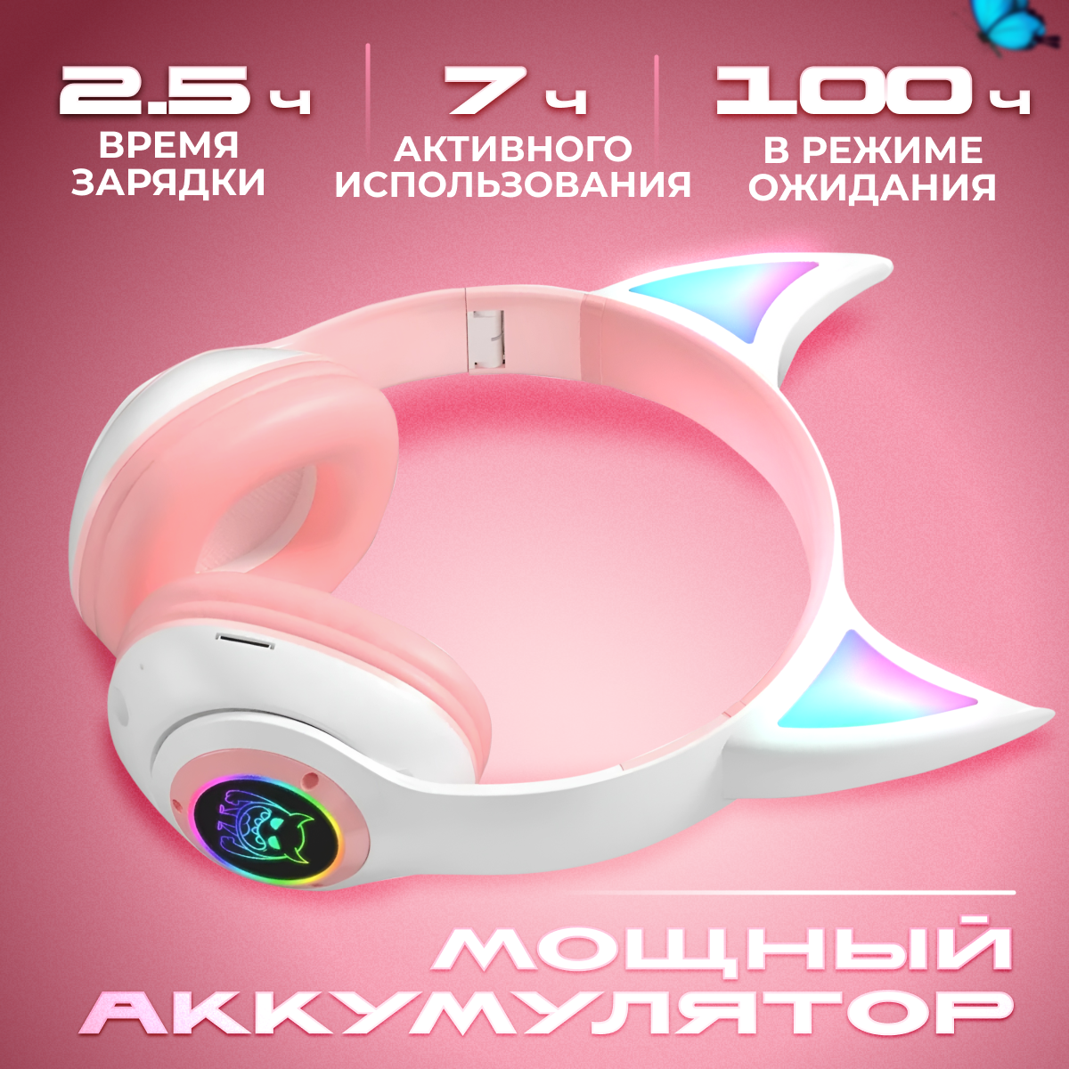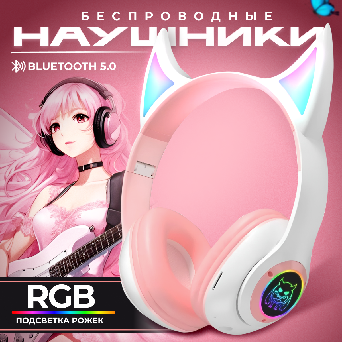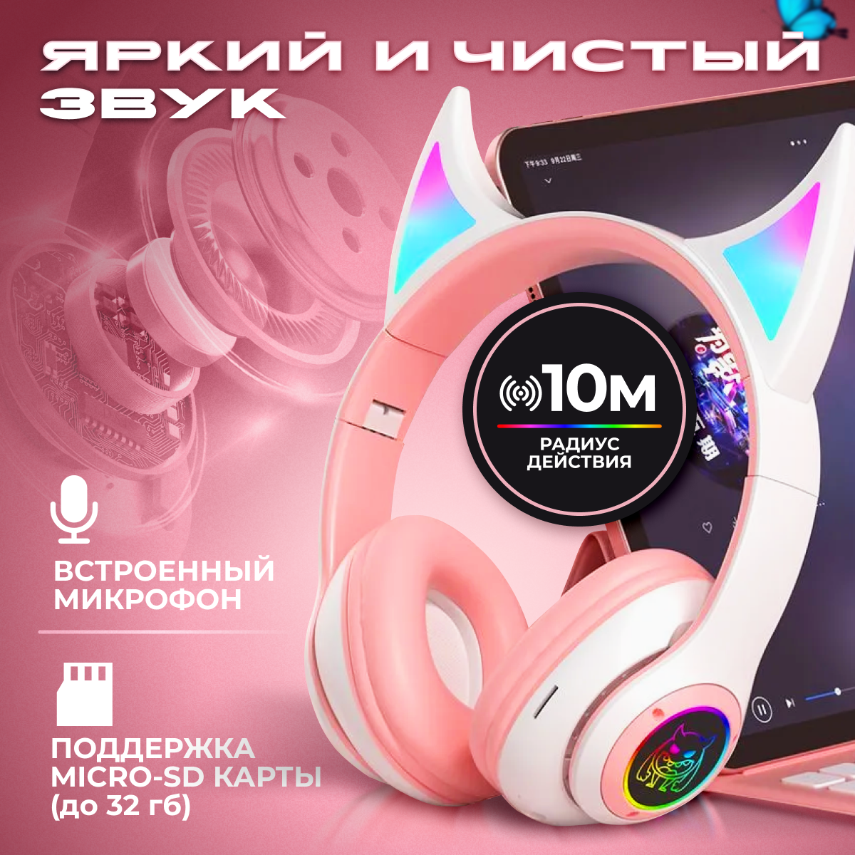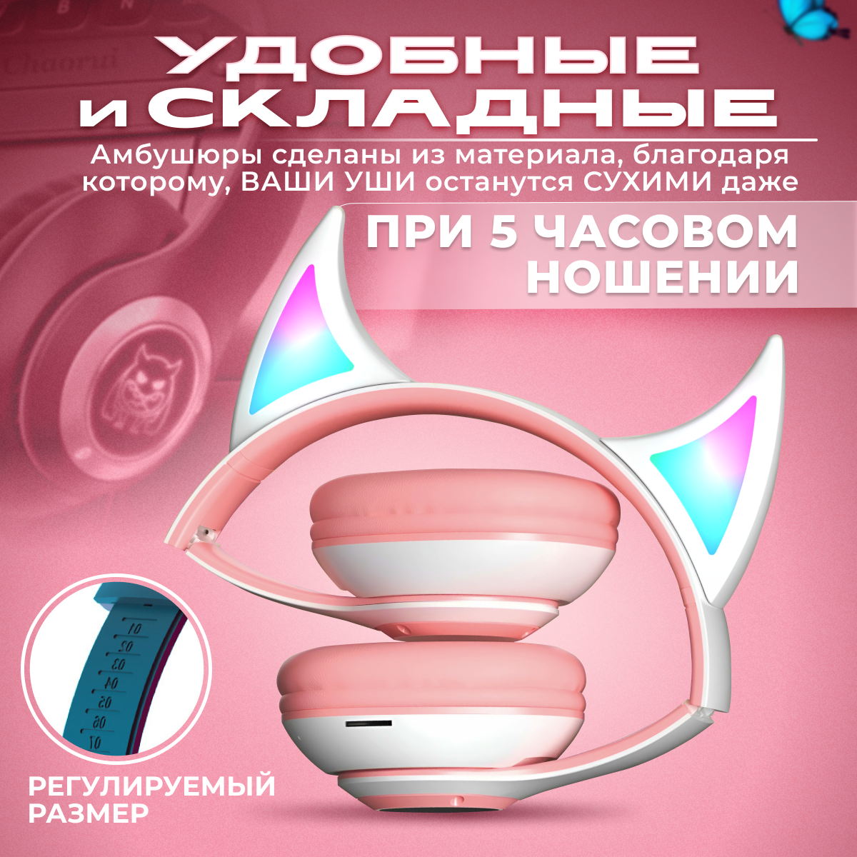 Наушники полноразмерные беспроводные розовые с светящимися RGB с ушками рожками, c микрофоном Bluetooth 5.0 интересное: