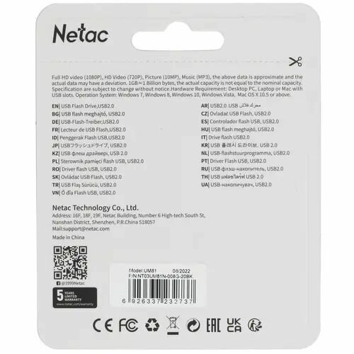 Флешка USB NETAC UM81 8ГБ, USB2.0, черный [nt03um81n-008g-20bk]