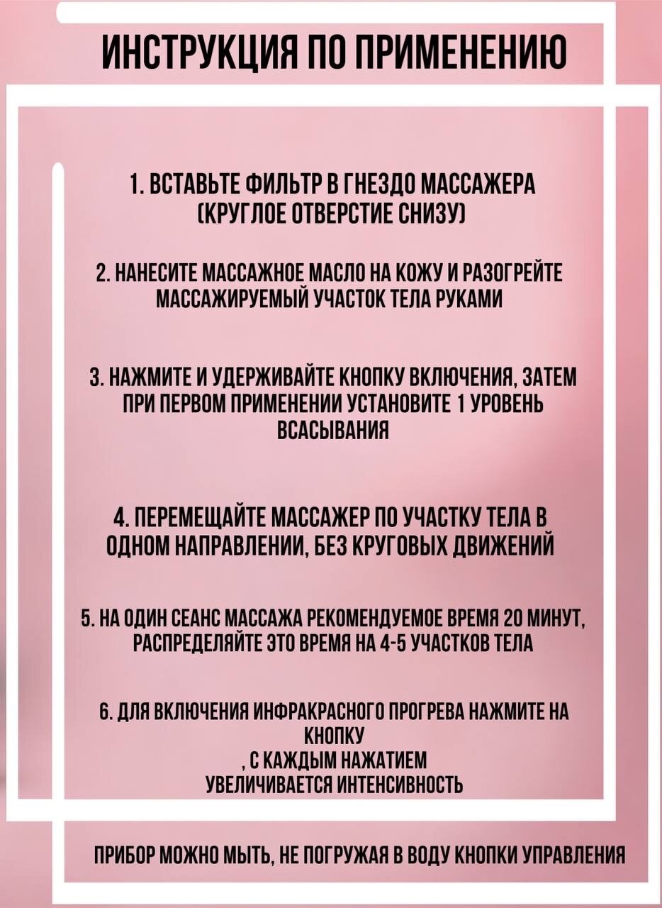 Совет начинающим: не надо долго держать прибор на одном участке кожи, не следует допускать сильного присасывания прибора к коже, лучше для начала на малой мощности довольно быстро водить вдоль массажный линий. При присасывании нажимать кнопку сброса.