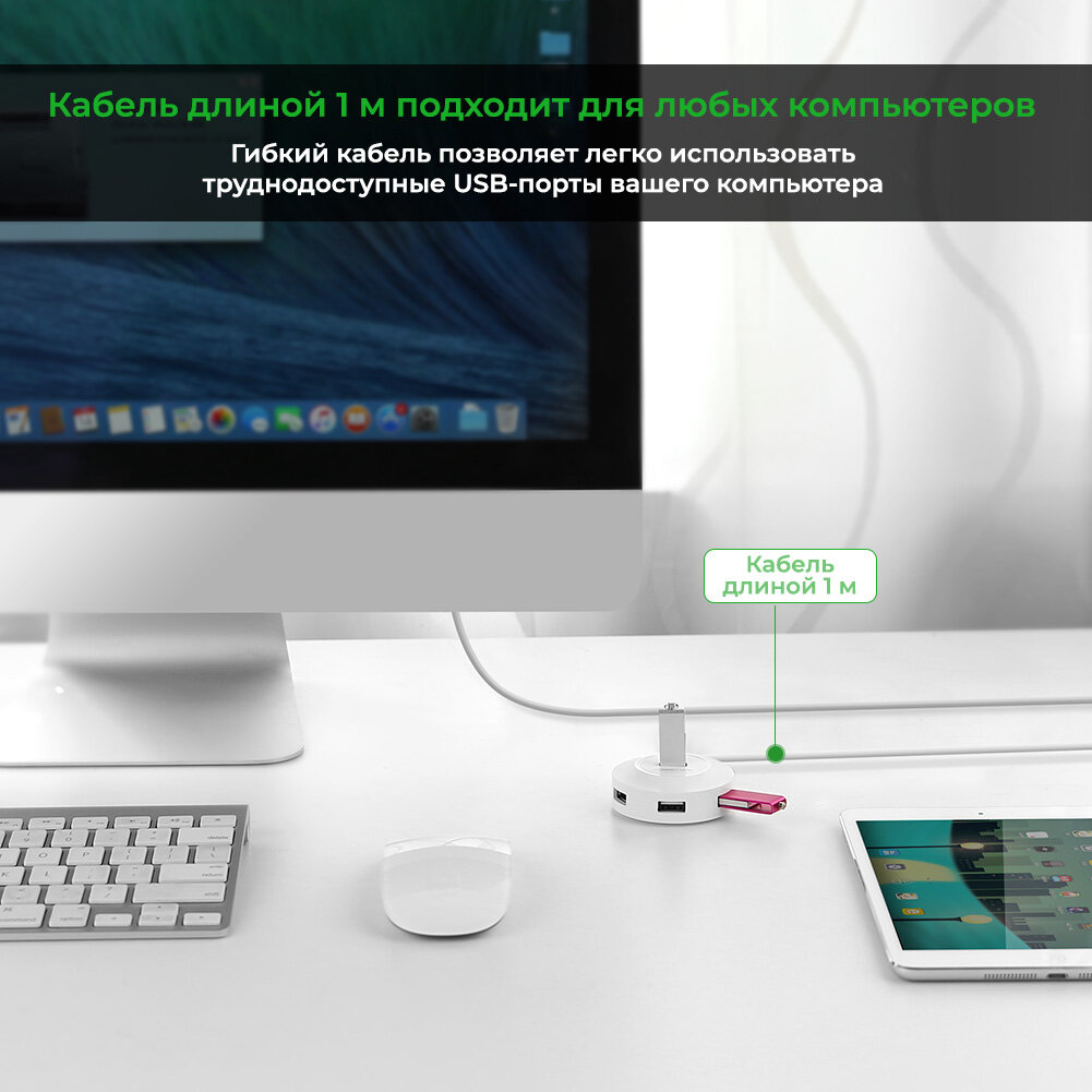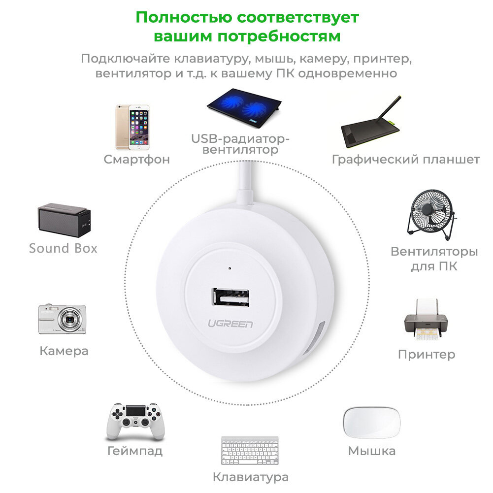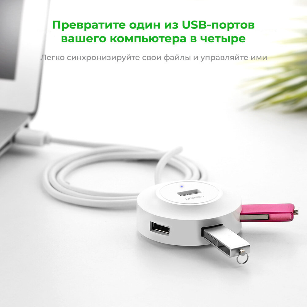 Хаб UGREEN CR106 (20270) USB 2.0 Hub 4 Ports. Длина: 1м. Цвет: белый