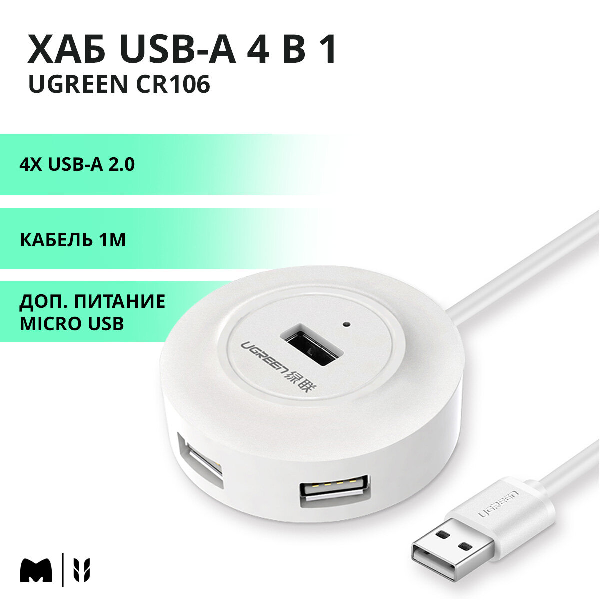 Хаб USB-A 4 в 1 UGREEN CR106 / 4xUSB-A 2.0, Жесткие диски до 10ТБ / Доп. питание Micro USB / Кабель 1м / цвет белый (20270)