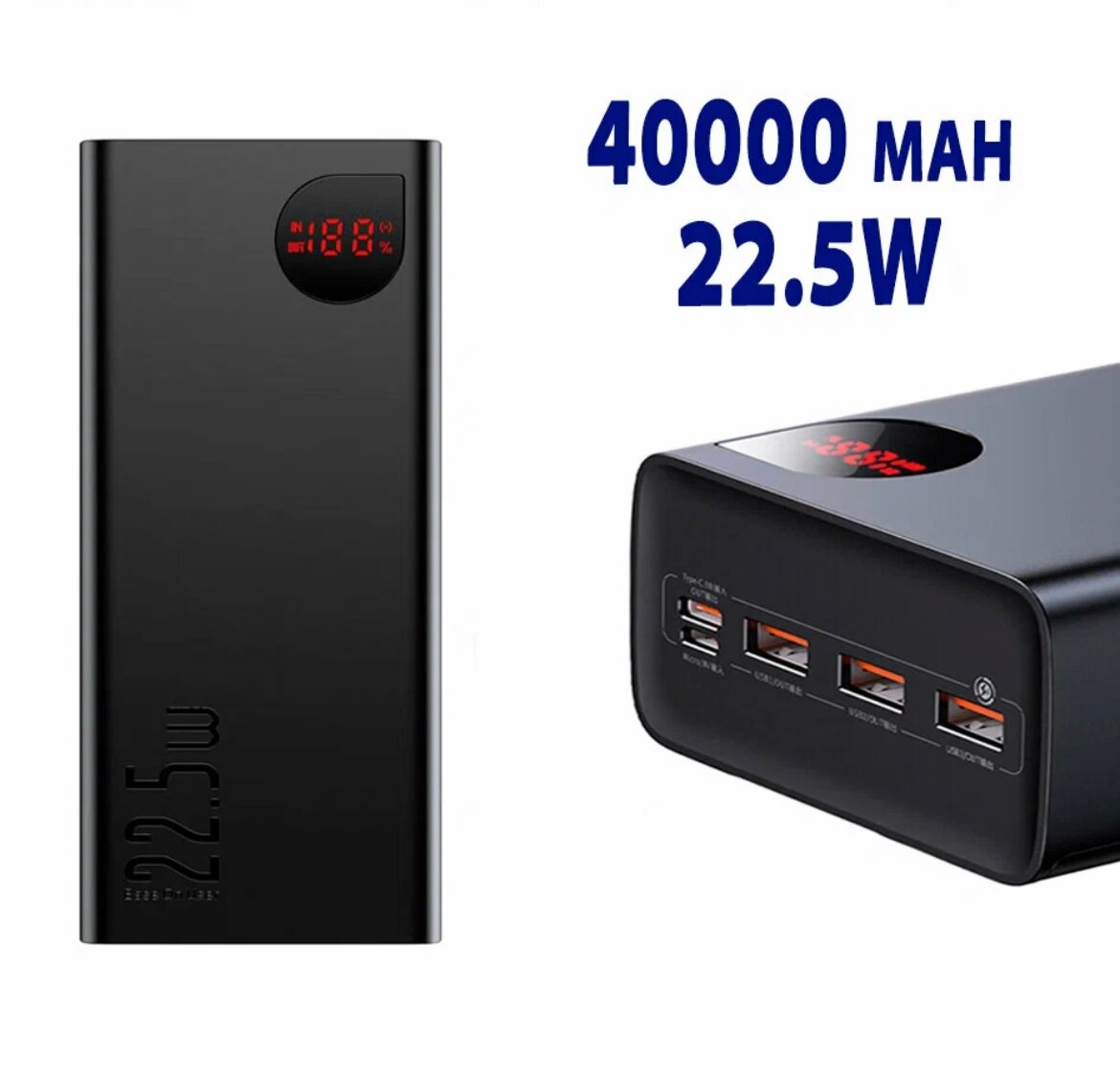 | Дополнительная информация | Внешний аккумулятор OS-Baseus Adaman Digital Display Fast Charge Power Bank 40000mAh 22.5W с кабелем USB to Type-C 0.3m (PPAD020101) Черный |