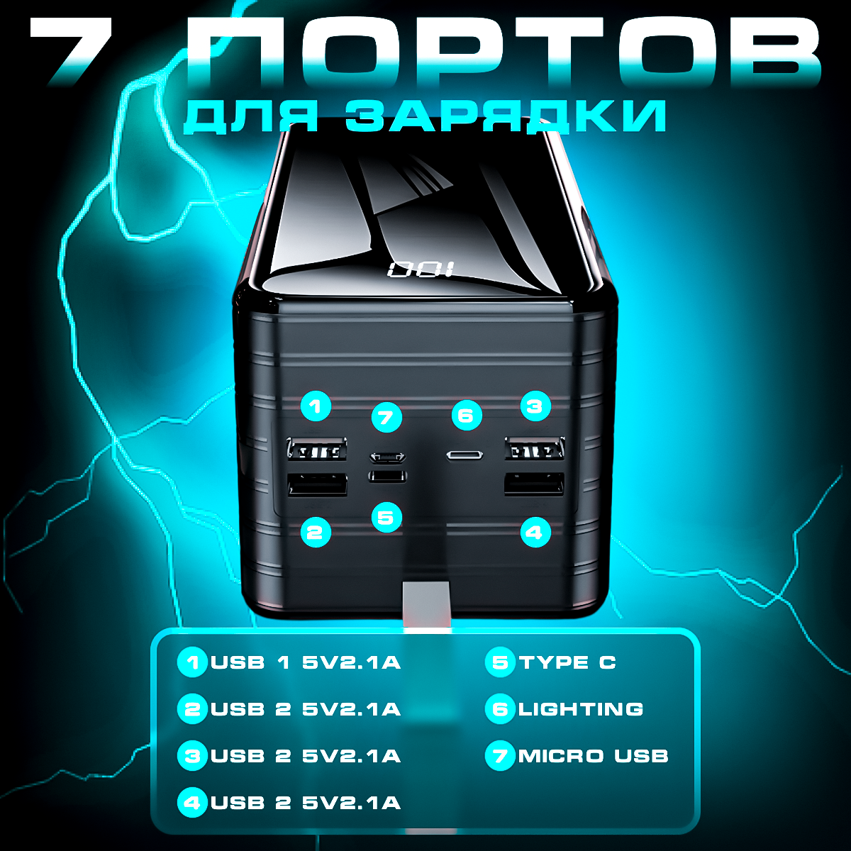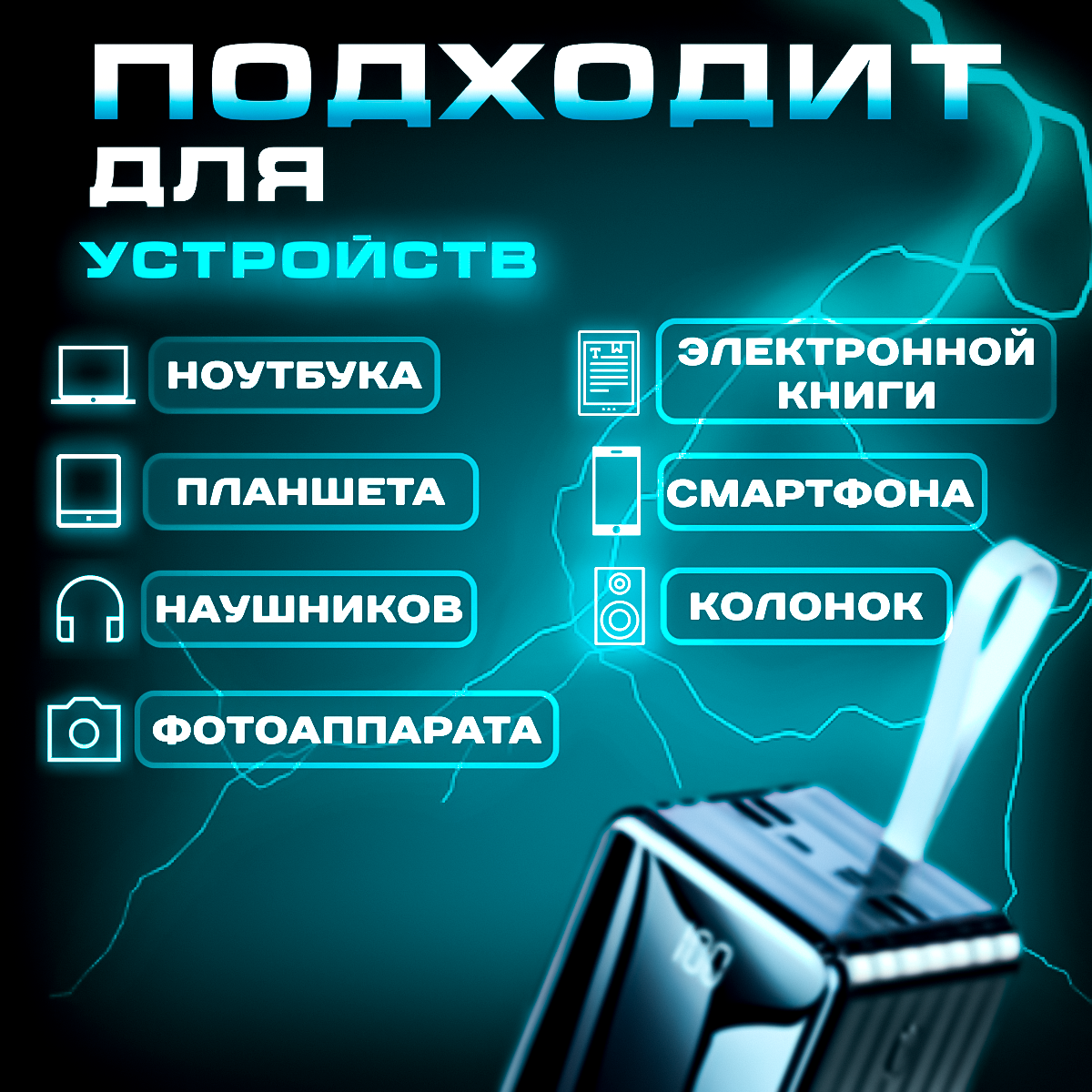 Внешний аккумулятор, Повербанк на 100000 mah с быстрой зарядкой, со встроенными кабелями Type-C, microUSB, Lightning, USB интересное: