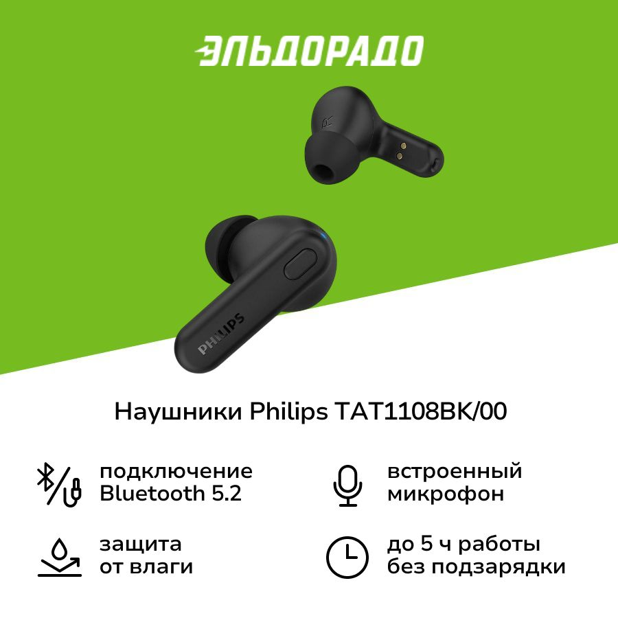Philips Наушники TAT1108BK 00 Наушники TWS вакуумные с микрофоном, черный