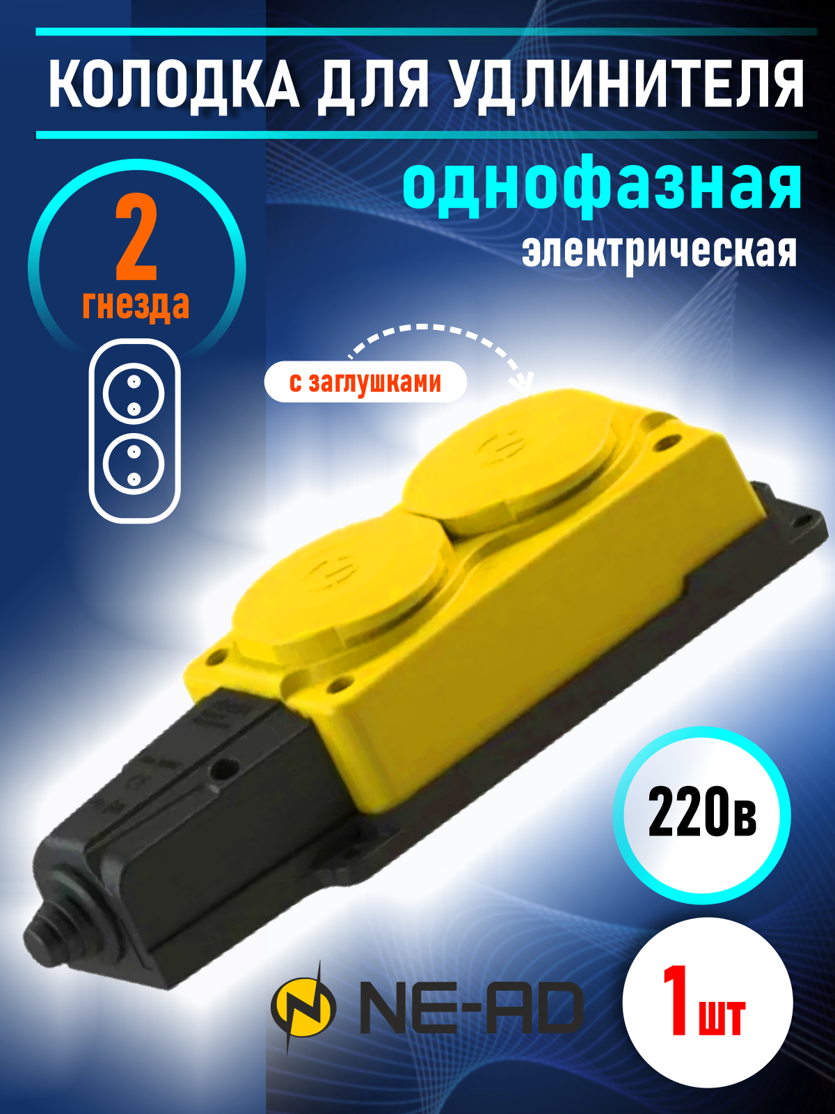 СохранитьКолодка электрическая для удлинителя колодка двойная NE-AD 2-нг с/з с крышками 16А, IP54, желтый/черный (каучук) интересное: