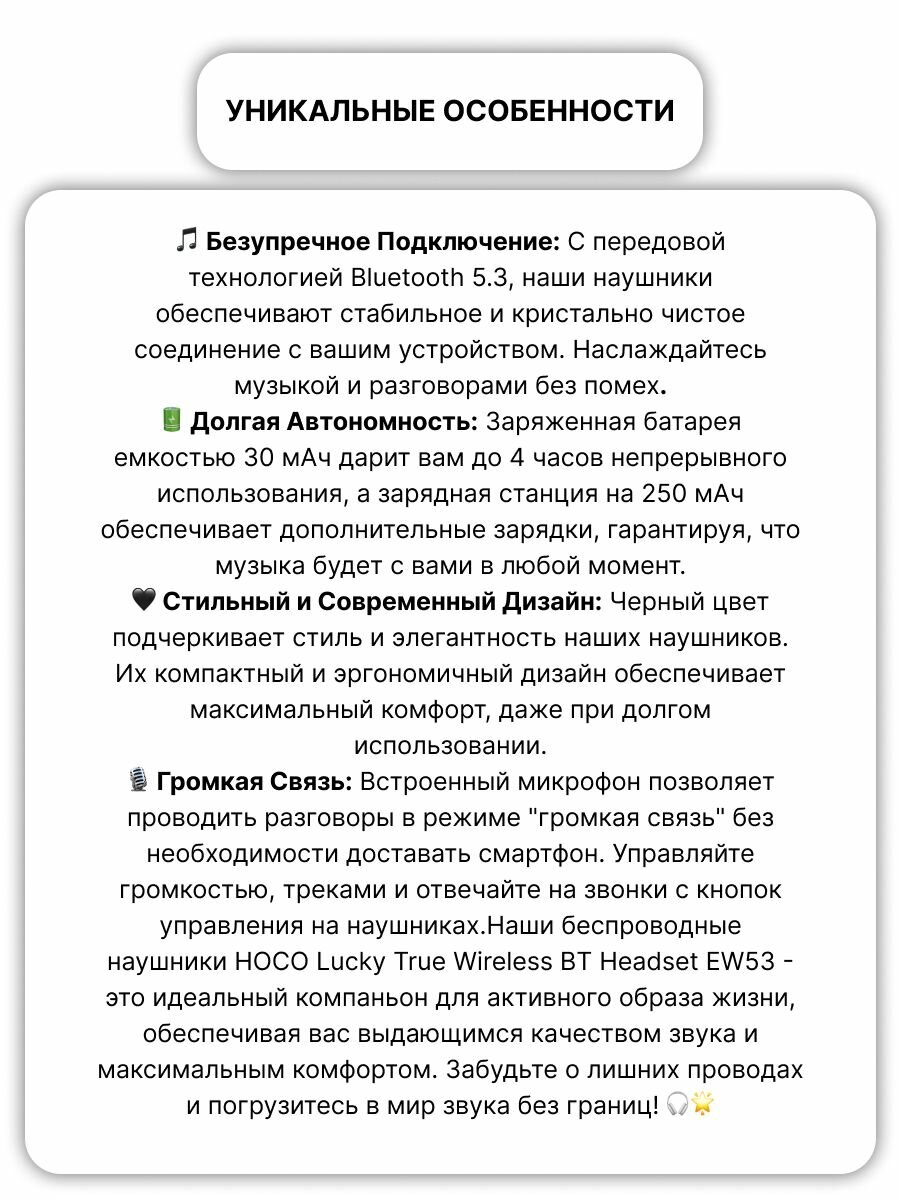 Ниже Вы можете прочитать отзывы на Наушники HOCO EW53 Lucky BT 5.3, вкладыши TWS(черный), ознакомится с подробными характеристиками, посмотреть интересные обзоры и фотографии на Наушники HOCO EW53 Lucky BT 5.3, вкладыши TWS(черный).
