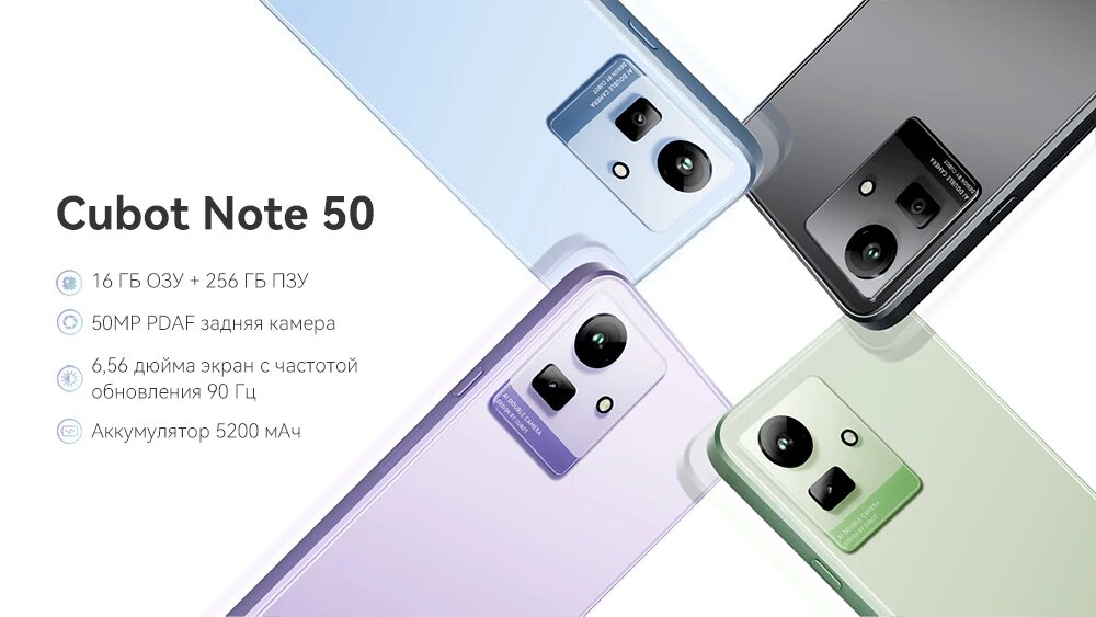 Cubot NOTE 50, 16 ГБ ОЗУ (8 ГБ + 8 ГБ расширенной), 256 ГБ ПЗУ (TF-карта с расширением до 1 ТБ), экран 6,56 дюйма,90 Гц, NFC, камера 50МП, WIFI, Bluetooth, GPS, добавление в корекция