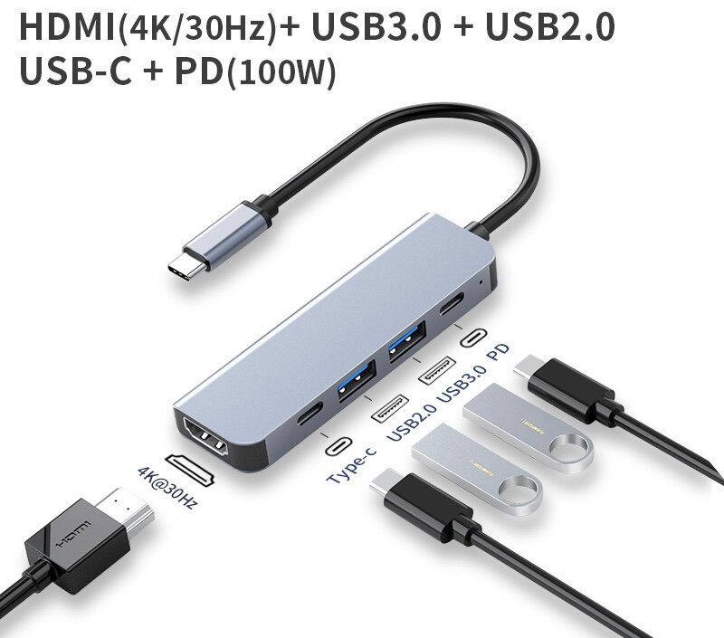 Купить Хаб/концентратор 5 в 1 Type-C to 2x USB 3.0 / 1x Type-c(USB-C) / 1x PD / 1x HDMI(HDTV)