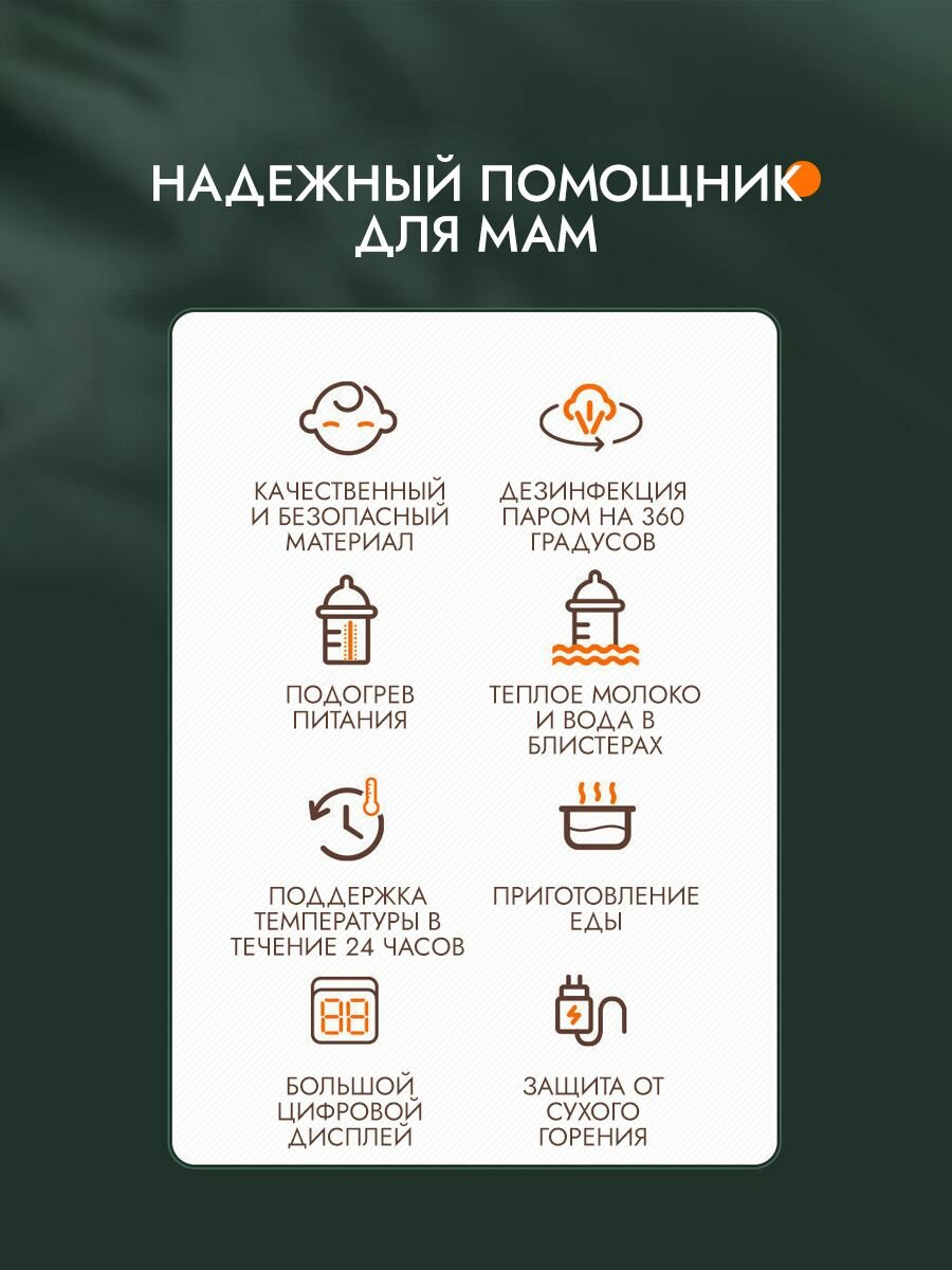 | Особенности | автоотключение, для всех типов бутылочек, поддержка заданной температуры, подогрев 2 бутылочек, функция разморозки |