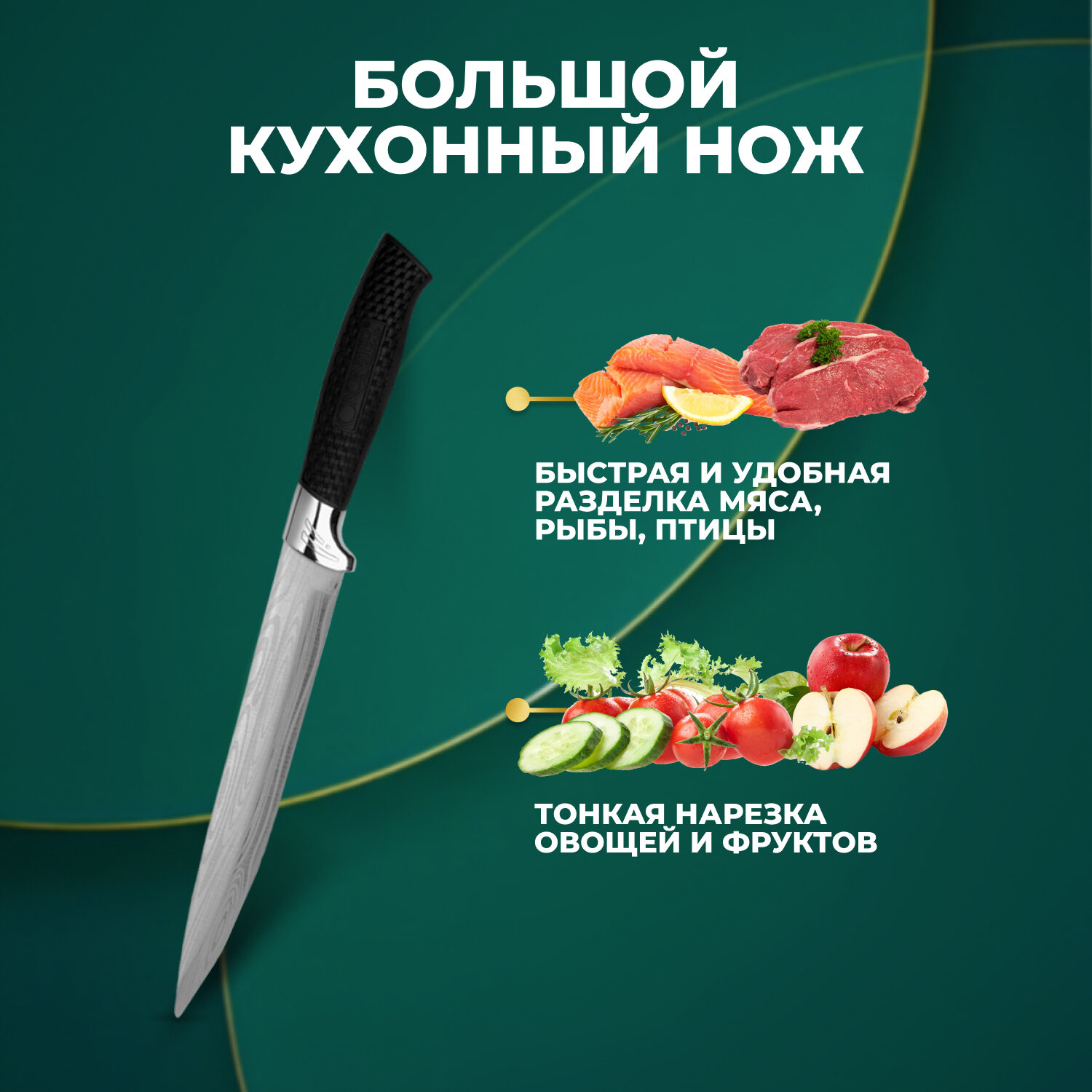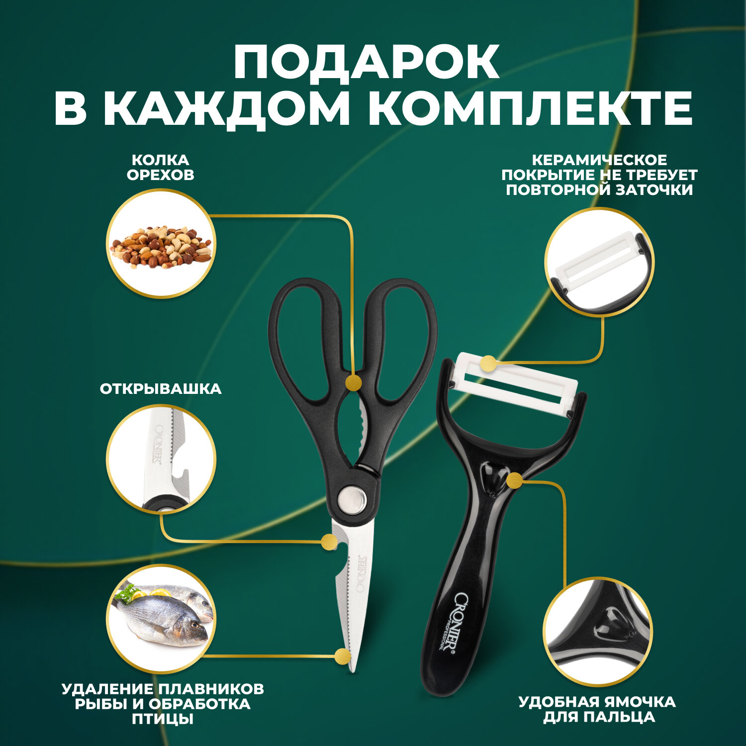 | Комплектация | Шеф нож; Разделочный нож; Большой тесак; Универсальный нож; Кухонные ножницы; Керамическая офощечистка |