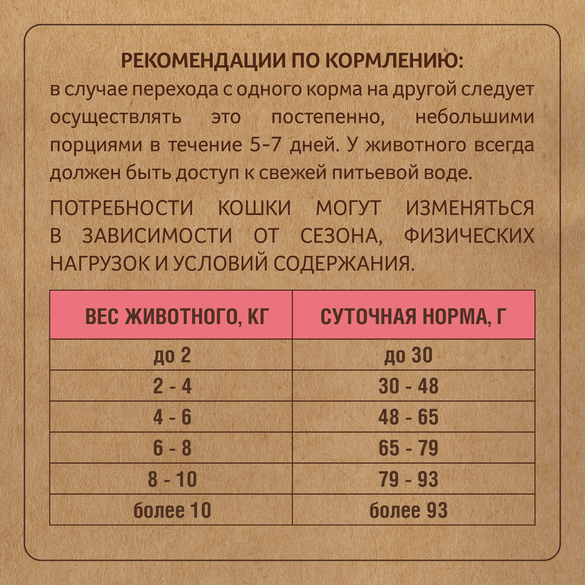 | Дозировка | Рекомендации по кормлению: вес животного до 2кг – суточная норма до 28г; вес животного до 2-4кг – суточная норма до 28-46г; вес животного до 4-6кг – суточная норма до 46-63г; вес животного до 6-8кг – суточная норма до 63-77г; вес животного до 8-10кг – суточная норма до 77-91г; вес животного более 10кг – суточная норма более 91г; |