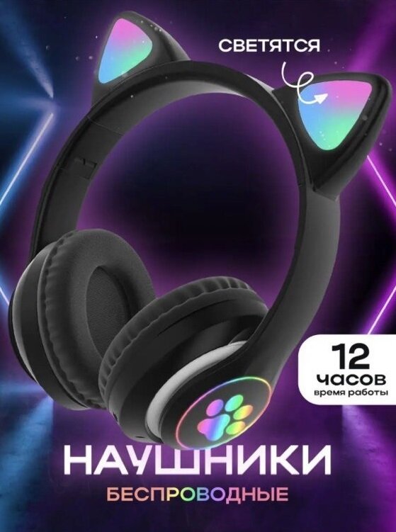 Купить Яркие и стильные наушники с ушками Кошки и разноцветной подсветкой STYLISH/Отличное Hi-Fi Stereo звучание /Мощные басы/Черные
