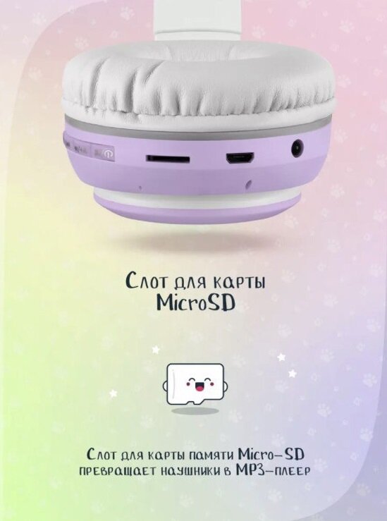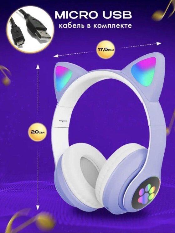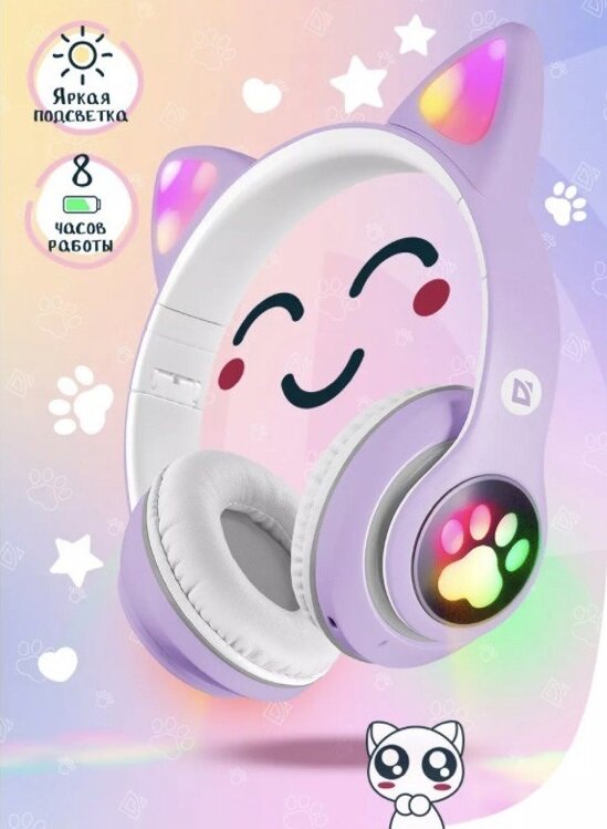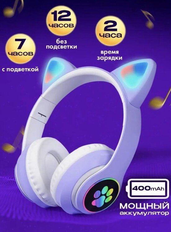 Купить Яркие и стильные наушники с ушками Кошки и разноцветной подсветкой STYLISH/Отличное Hi-Fi Stereo звучание /Мощные басы/Фиолетовый