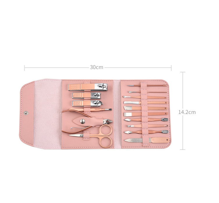 Профессиональный маникюрный набор из 16 предметов MyPads A156-950 для маникюра, педикюра, инструменты по уходу за лицом из высококачественной нержавеющей стали с бежевым матовым покрытием и стильным чехлом из экокожи розового цвета