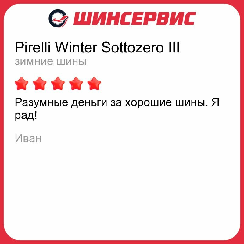 | Отзыв: | Начал третий сезон на соттозеро 3. Хорошие шины по поведению на скорости, четкости рулежки и стабильности и уверенности торможения. Подходят для динамичной езды, если позволяет погода. Справляются и со снегом, и с мокрой дороге на отлично. Тихие, комфортные. |
