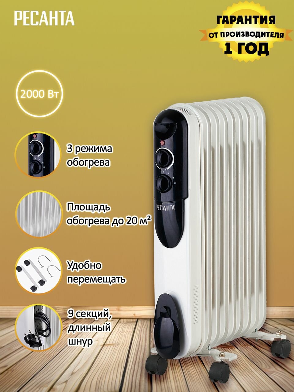 Масляный радиатор РЕСАНТА ОМПТ-9Н// 2кВт, 25 кв.м., 9 секций, обогреватель для дома, дачи, гаража, склада