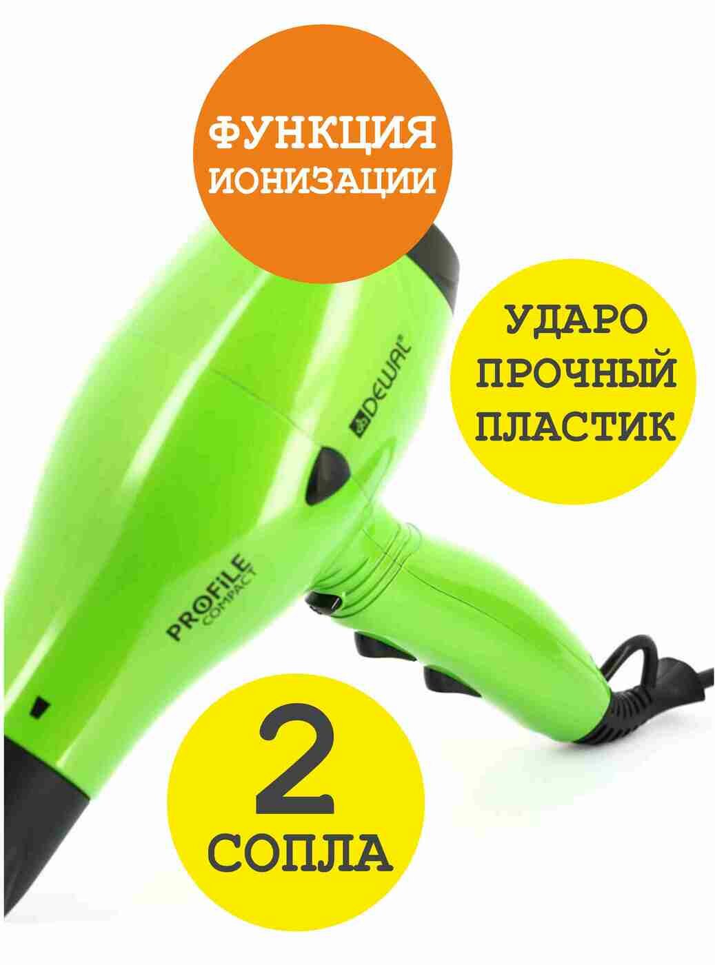 Фен DEWAL Profile Compact зеленый, 2000 Вт, ионизация, 2 насадки