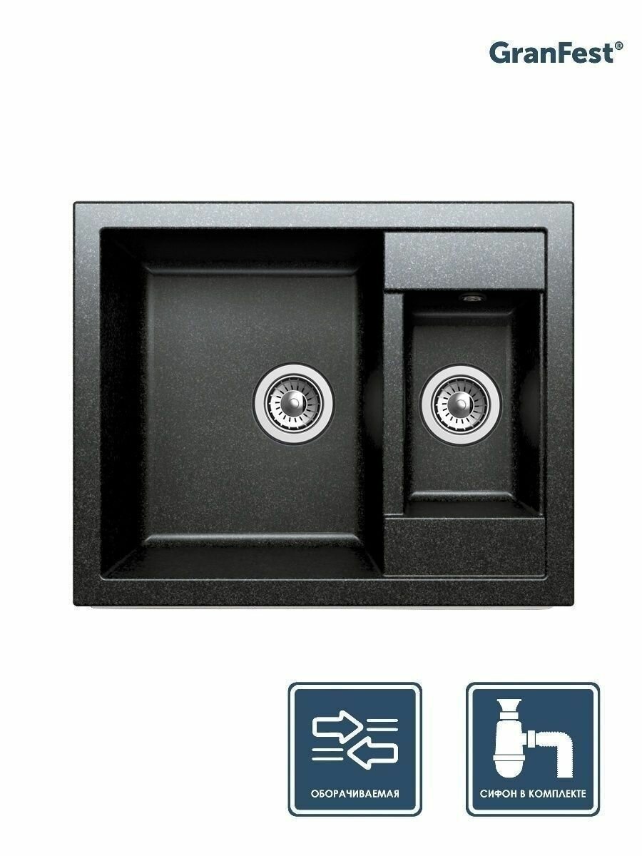 Кухонная мраморная мойка Granfest QUADRO GF-Q610K, 1,5-чашевая, прямоугольная, оборачиваемая, 610*500 мм, цвет черный/Раковина для кухни