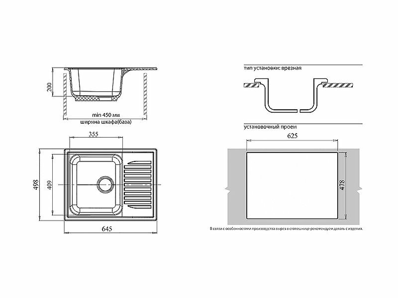 Мойка кухонная GranFest STANDART GF-S-645L чаша с крылом 645*498 мм графит, мрамор