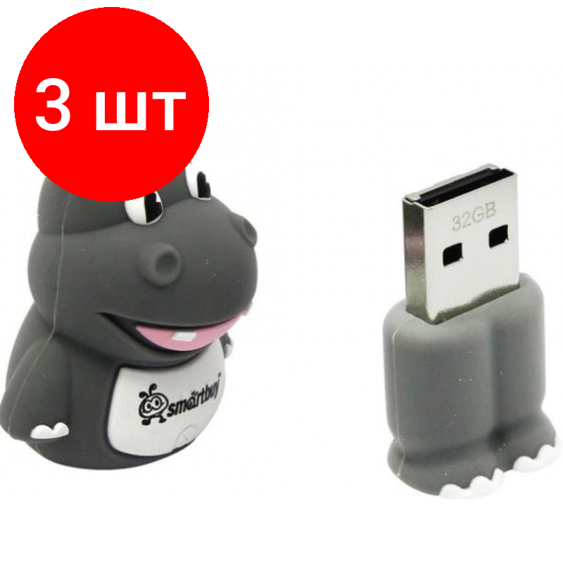 Купить Комплект 3 штук, Флеш-память Smartbuy Wild series, 32Gb, USB 2.0, гиппопотам, SB32GBHip