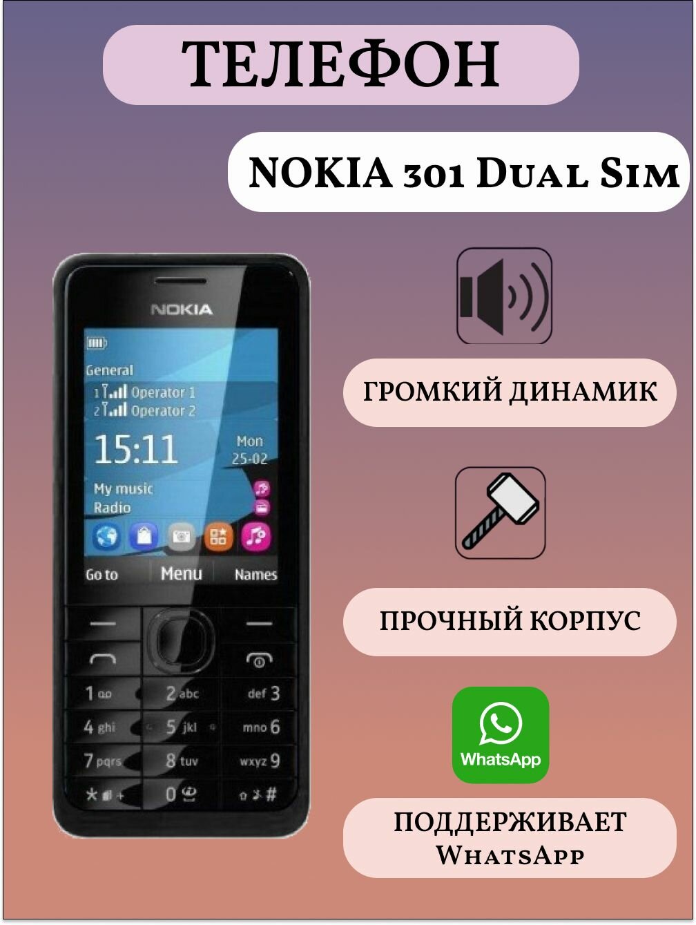Ниже Вы можете прочитать отзывы на 301 DualSim Мобильный кнопочный телефон, ознакомится с подробными характеристиками, посмотреть интересные обзоры и фотографии на 301 DualSim Мобильный кнопочный телефон.