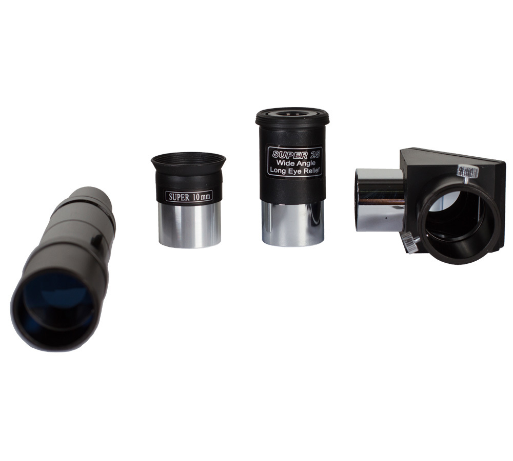 | Комплектация | труба телескопа, окуляры 25 мм и 10 мм, диагональное зеркало 90°, оптический искатель 6x30, экваториальная монтировка EQ2, тренога |