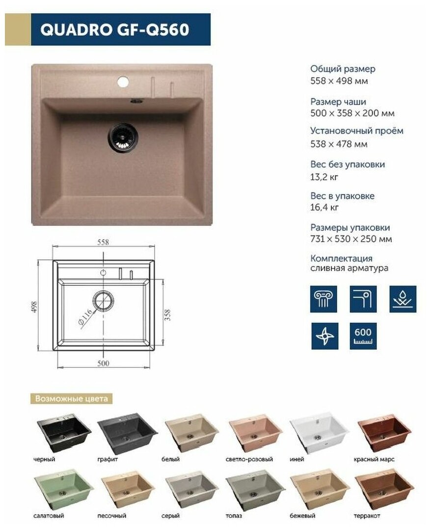 Мойка кухонная врезная, GranFest, Quadro, искуственный мрамор, 558х498 мм, + сифон, песочная, GF-Q560
