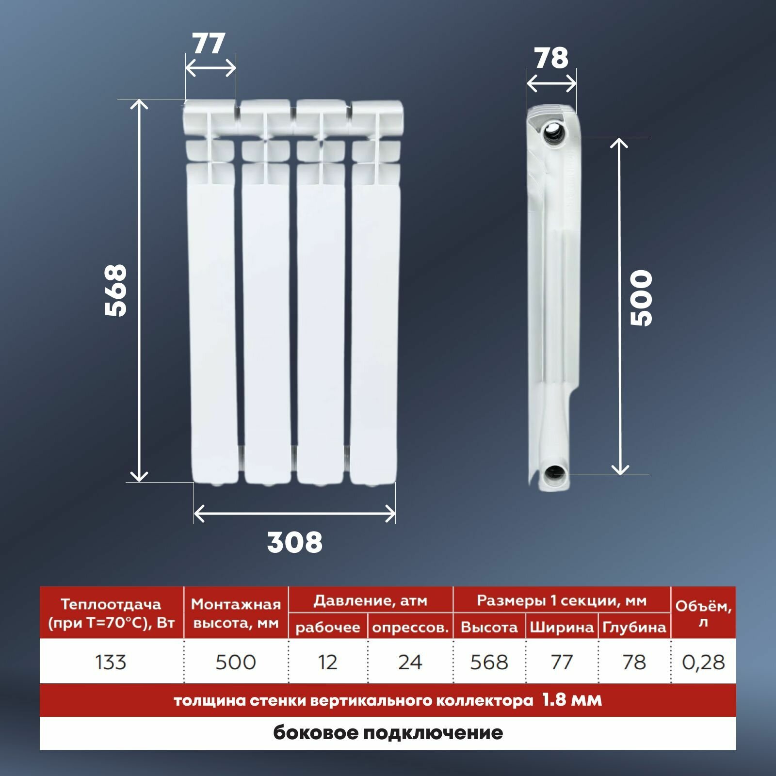 Алюминиевый радиатор Rommer Optima AL 500 \ 04 секций \ с боковым подключением