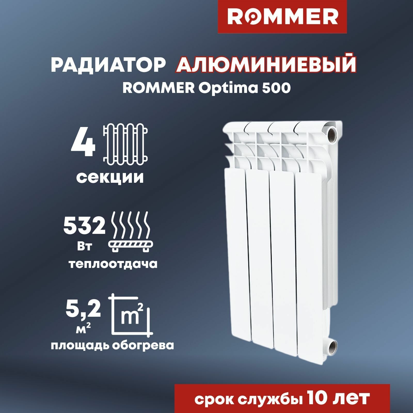 Радиатор алюминий, 500х80 мм, Rommer, Optima, 4 секции, 89556