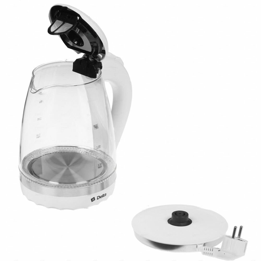 Электрочайник DELTA DL-1202, корпус из жаропр. стекла, белый: 2200 Вт, объем 1,5 литра