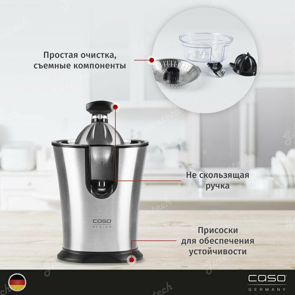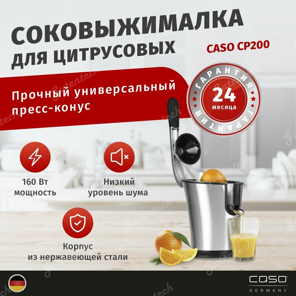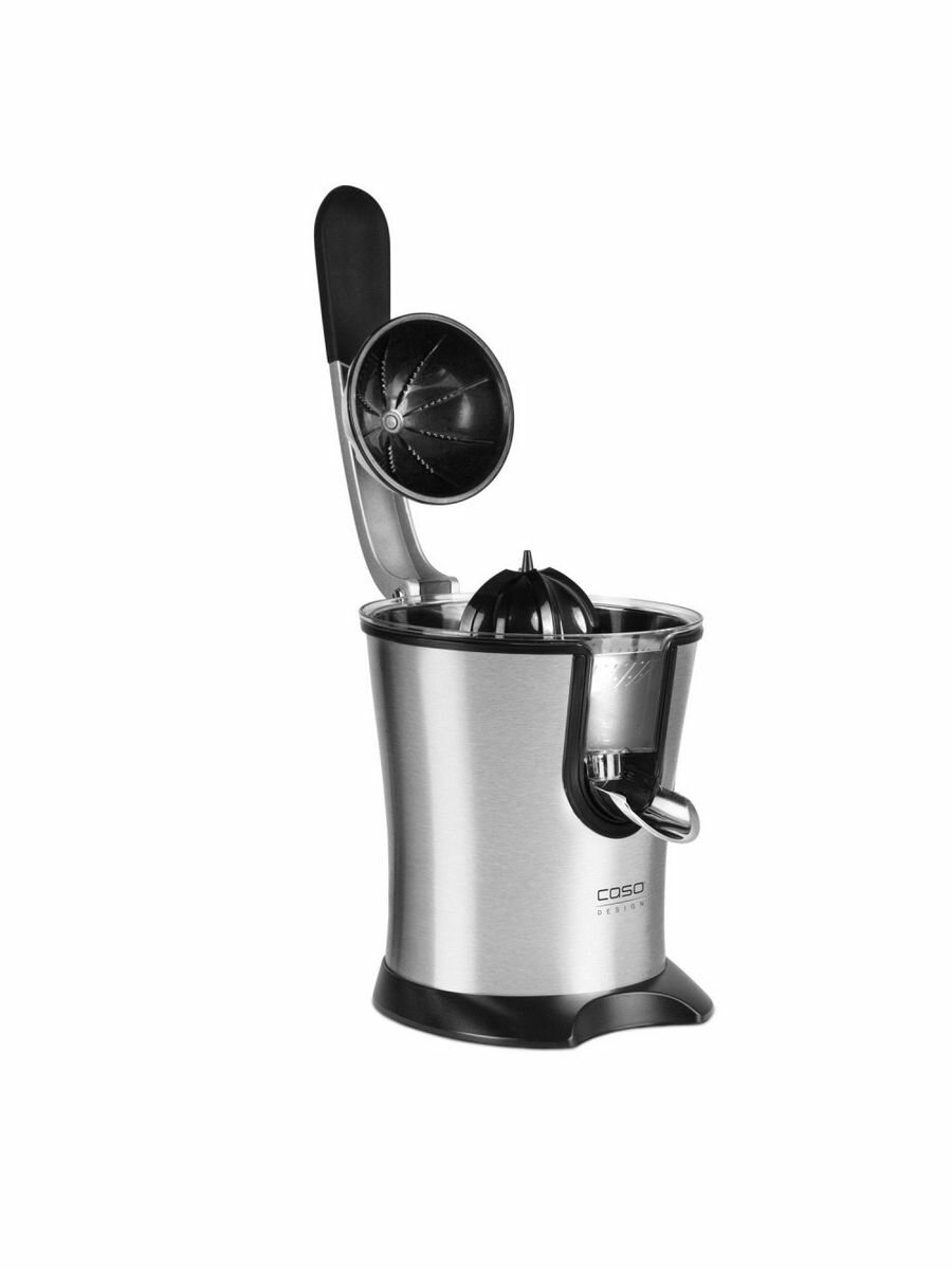 Дизайнерская соковыжималка для цитрусовых Caso CP 200, электрическая и мощная соковыжималка для лимона с универсальными пресс-конусами для всех распространенных цитрусовых, 160 Вт, система капля-стоп , сетчатый фильтр из нержавеющей стали, рычаг прижима