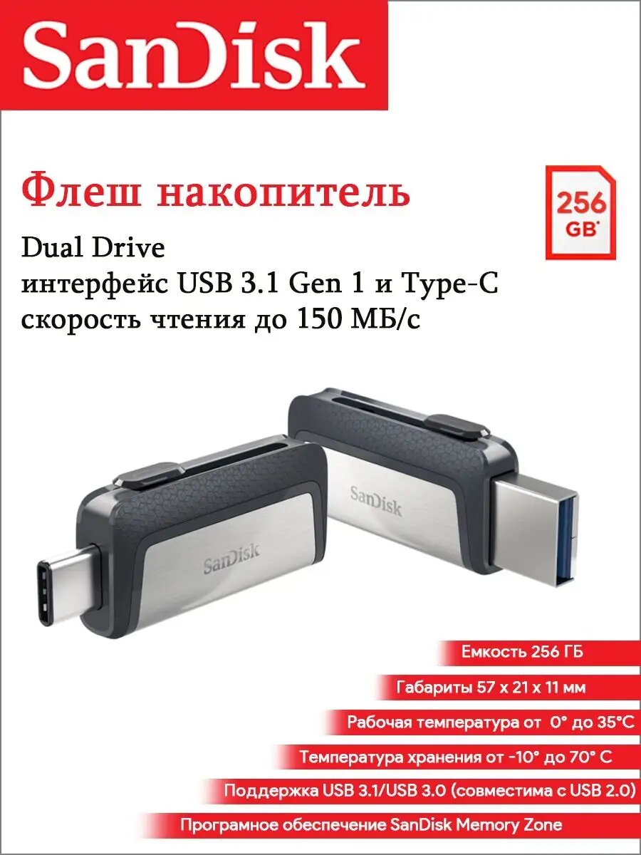СохранитьUSB Flash накопитель 256GB SanDisk Ultra Dual (SDDDC2-256G-G46) USB3.1/Type-C (OTG) Черный интересное:
