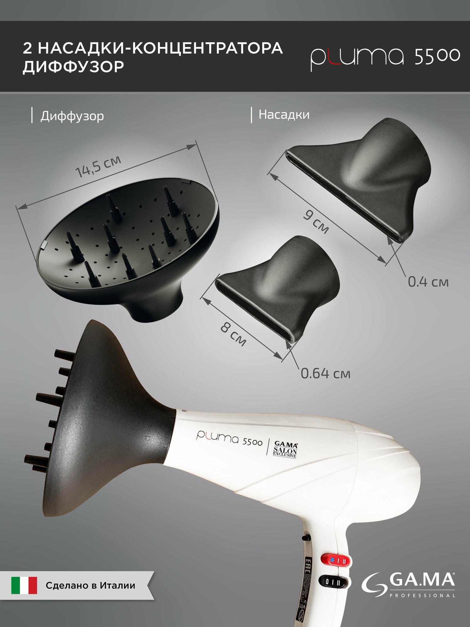 Ga-Ma PLUMA II 5500 OXY-ACTIVE Фен с ионизацией, W 2400 Вт, 2 сопла и диффузор в комплекте, белый