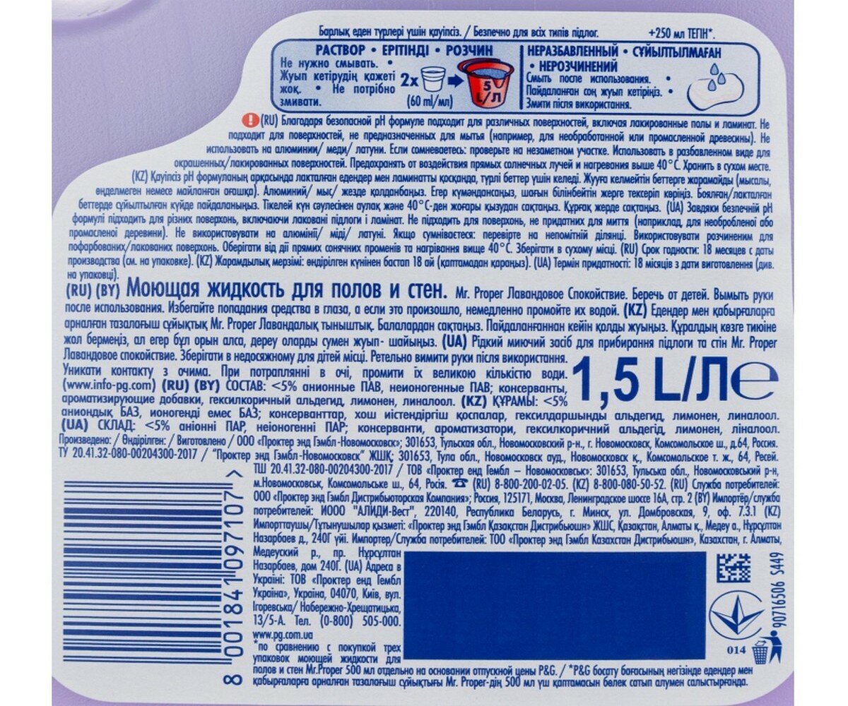 MR. PROPER Моющая жидкость для полов и стен Лавандовое Спокойствие 1.5л 0001008331