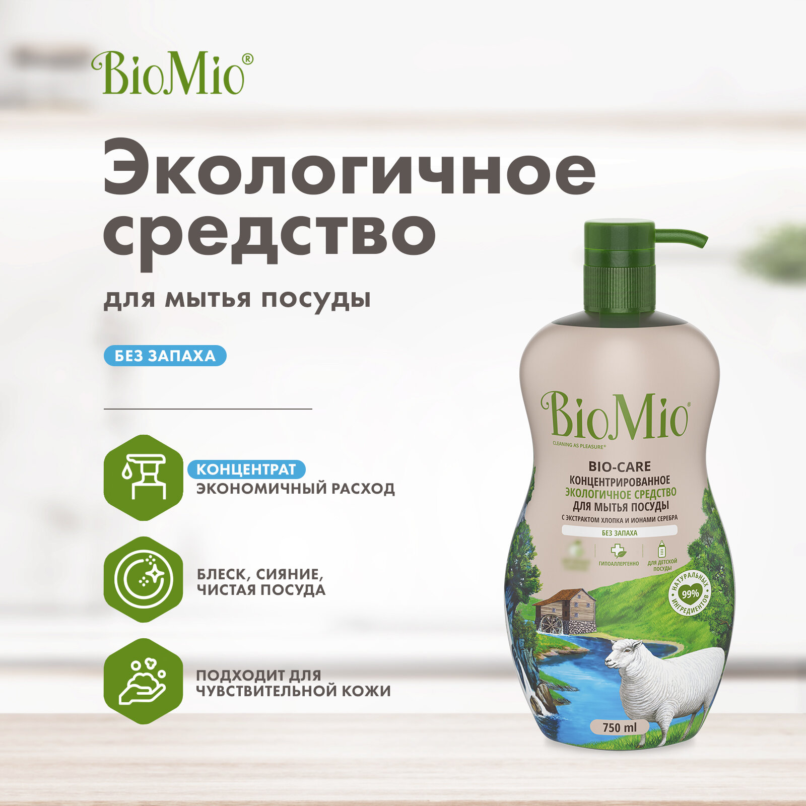 Средство для мытья посуды BioMio Bio-care, без запаха, 750 мл