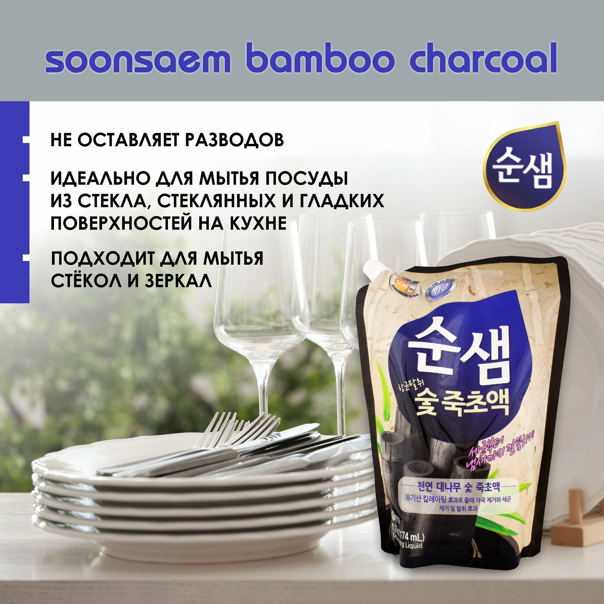 Aekyung Soonsaem Bamboo Charoal Средство для мытья посуды Бамбуковый уголь 1174 мл в мягкой упаковке