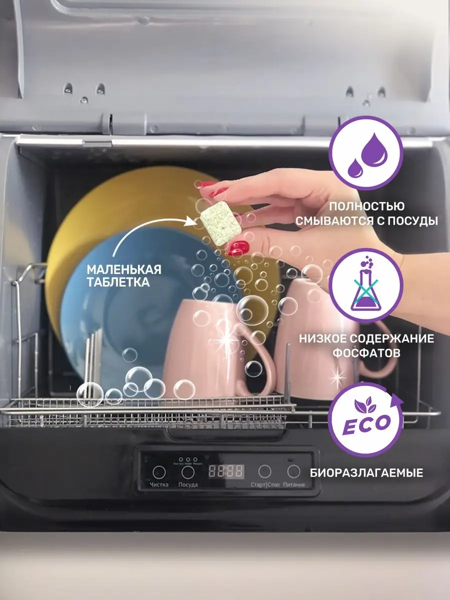 | Плюсы: | Если не много посуды, делить таблетки не надо)) |
