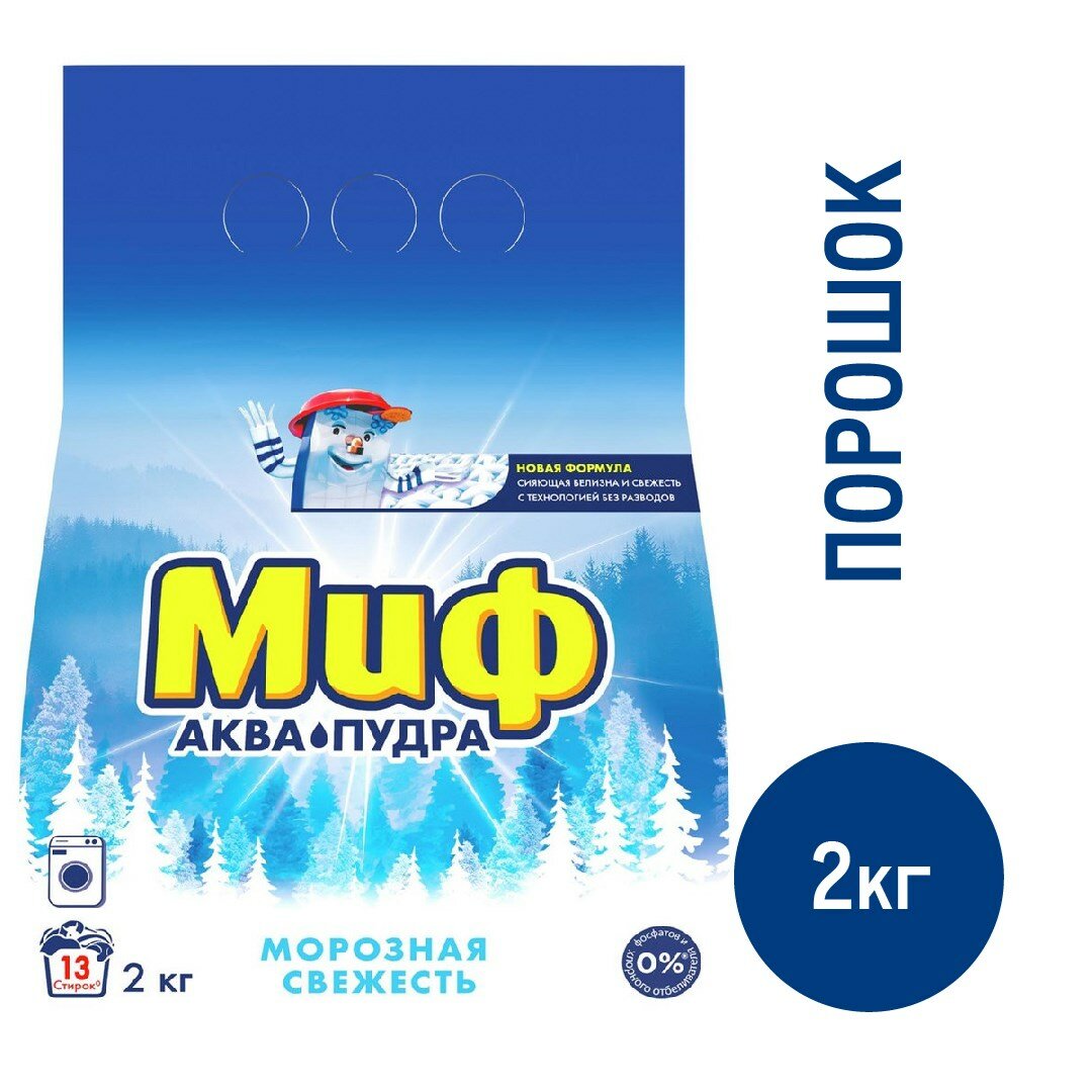 Порошок стиральный Миф Аквапудра для любого вида белья аромат морозной свежести автомат 2кг / моющее средство