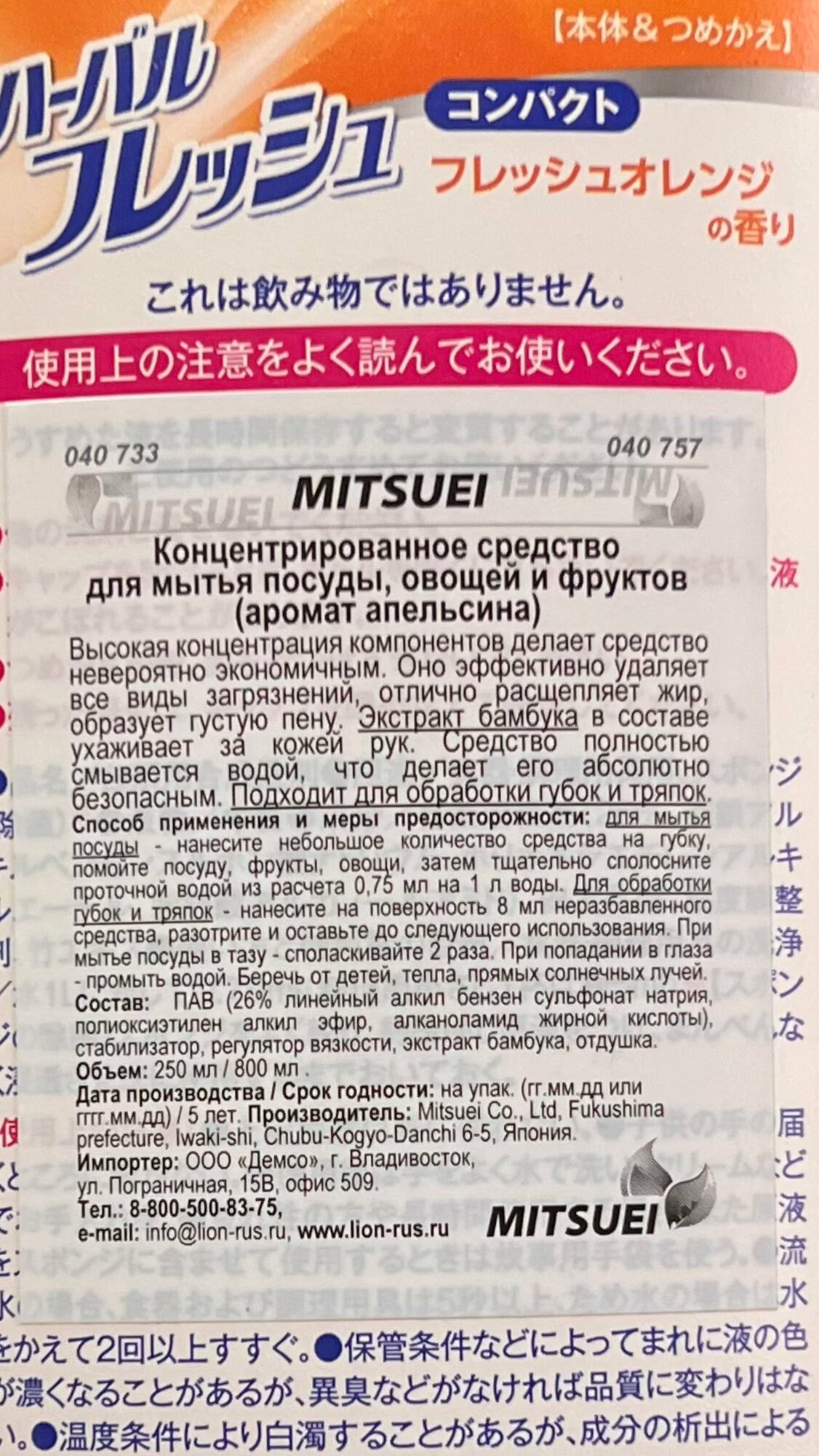 Mitsuei cредство для мытья посуды, фруктов и овощей аромат апельсин бутылка-дозатор 600мл