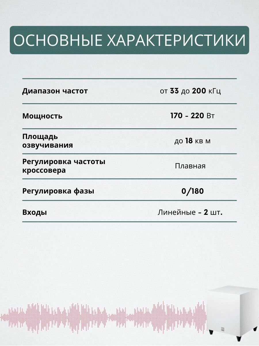 Имеет вход LFE, регулировку частоты среза, переключение фазы, автовключение/выключение, переключение питания 110/220, нижнее расположение динамика и фазоинвертора, лаконичный дизайн, компактный размер. Удивительно хорошо дополняет музыкальную сцену. Не гудит. Имеет большой запас мощности. Удивительно мало стоит для своих свойств. |
